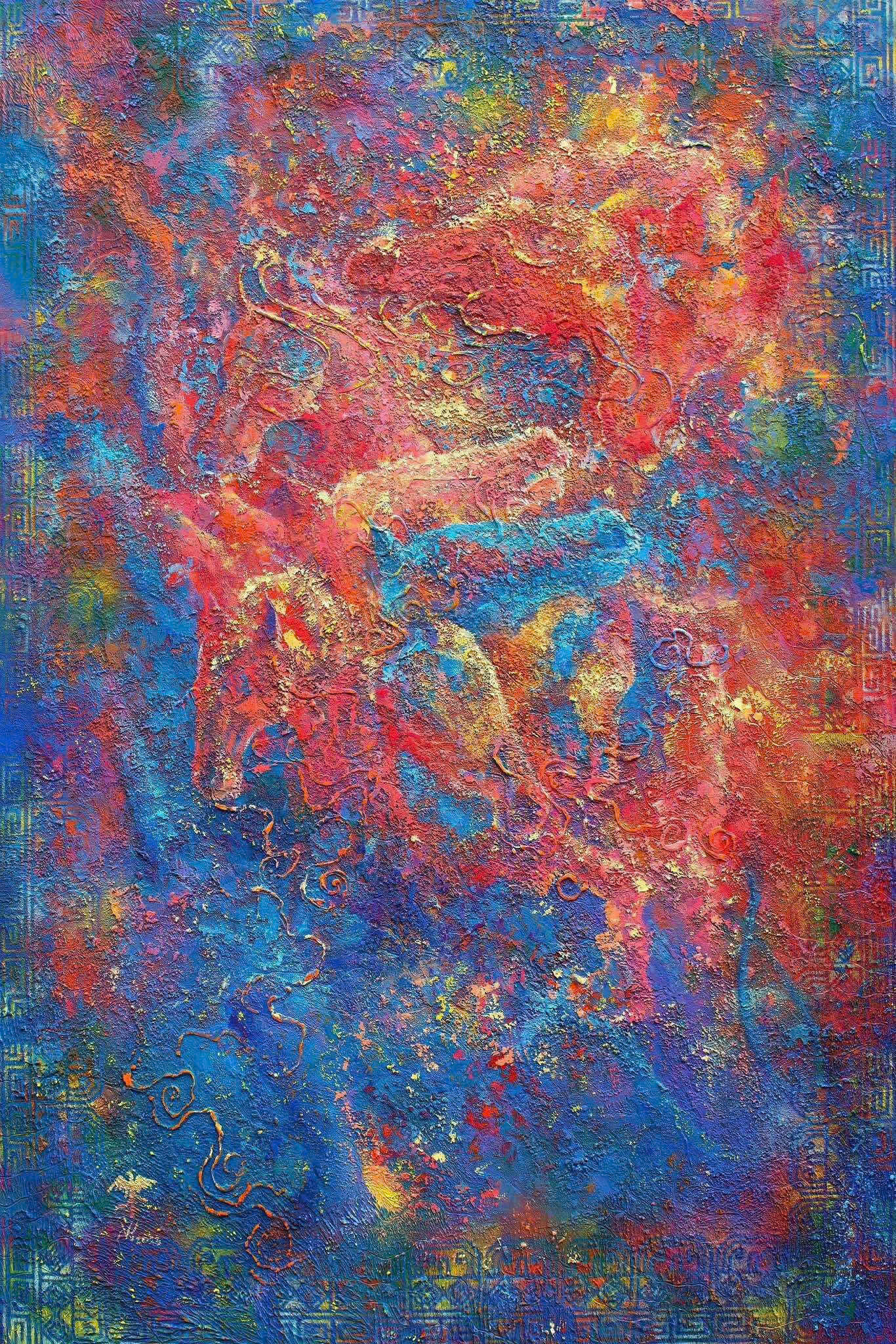 “Thiên Mã” sáng tác năm 2024, là hành trình tâm tưởng về khát vọng và trí tuệ. Tám con ngựa được thể hiện qua những mảng màu lam, đỏ, vàng sôi động, tượng trưng cho sức mạnh, tự do và tinh thần bền bỉ. Trong đó, hai con quay đầu ngược hướng, chi tiết nhỏ nhưng chứa đựng triết lý lớn: dù rong ruổi đến đâu, vẫn có những khoảnh khắc cần lắng lại để nhìn về nguồn cội, về đồng hành và đoàn kết. Tác phẩm mô phỏng hình ảnh một con ngựa phi nước đại, hòa trong chuyển động và ảo ảnh của hình khối như thể đang vượt thoát khỏi ranh giới giữa thực tại và tâm linh. Ở đó, “ngựa” không chỉ là con vật, mà là biểu tượng của bản ngã mạnh mẽ, của tinh thần sáng tạo đang bứt phá. “Thiên Mã” vì thế không chỉ là lời chúc “mã đáo thành công”, mà còn là ẩn dụ cho hành trình con người từ vô thức hướng tới ánh sáng trí tuệ, từ hữu hạn vươn đến tự do tuyệt đối.