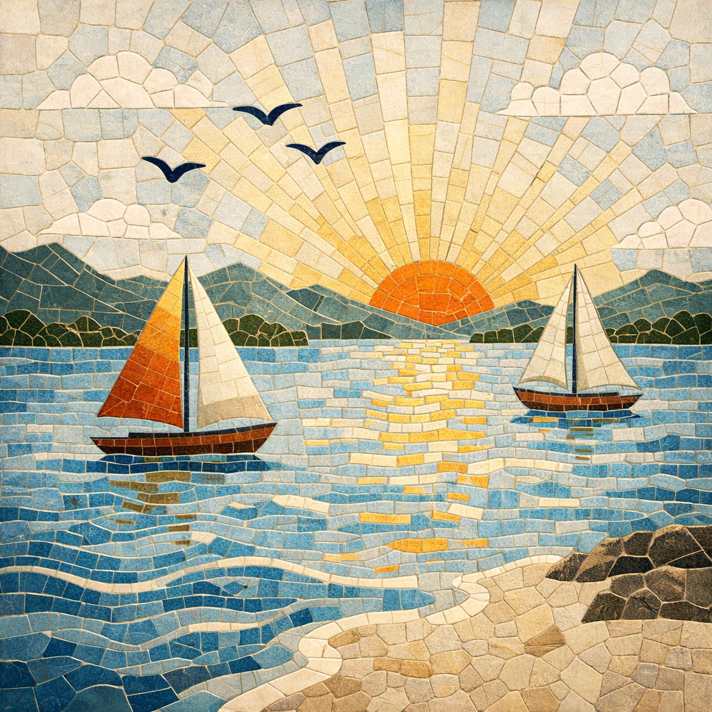 Bức tranh “Thuyền buồm trên biển dưới hoàng hôn” mang đến cảm giác bình yên và thư thái ngay từ ánh nhìn đầu tiên. Khung cảnh được thể hiện bằng phong cách mosaic độc đáo với những mảnh ghép tinh tế, tái hiện mặt biển lấp lánh dưới ánh nắng chiều rực rỡ. Hai chiếc thuyền buồm nhẹ nhàng trôi trên làn nước xanh, phản chiếu ánh hoàng hôn vàng cam ấm áp, tạo nên chiều sâu và sự chuyển động mềm mại. Phía xa là dãy núi và bầu trời với những áng mây nhẹ, điểm xuyết đàn chim bay tự do, gợi cảm giác tự do và an yên. Tổng thể bức tranh không chỉ là một tác phẩm trang trí mà còn là biểu tượng của sự cân bằng, thư giãn và những khoảnh khắc đẹp trong cuộc sống.