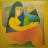 “Tình mẹ” sáng tác năm 2024 mở ra trong một không gian vàng lặng, nơi ánh sáng như rót xuống từ ký ức. Người mẹ bồng con trong dáng bước nghiêng, khuôn mặt chạm vào một vệt tím như dấu vết của nỗi lo và lòng thương sâu thẳm. Mọi hình khối được giản lược đến tinh tế, như thể cả thế giới đã nhòe đi, chỉ còn lại hai tâm hồn hòa làm một trong hơi ấm của sự chở che.