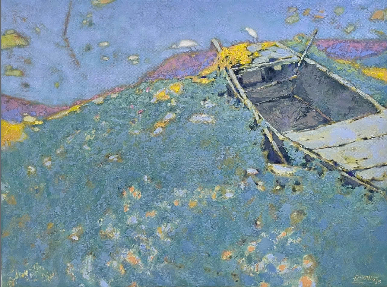 “Trăng Lên Bến Sông” sáng tác năm 2025, hiện lên giữa nền trời xanh và bãi cỏ vàng rực, tựa như khúc nhạc ngân dài của bao dòng chảy ký ức. Bao lần đưa khách sang sông, nay con đò nằm lại trong tĩnh lặng, để thời gian phủ lên lớp rêu phong của kỷ niệm. “Bóng đò xưa” gợi cảm xúc dịu dàng, nơi quá khứ vẫn thì thầm hiện diện, nhắc ta trân trọng những điều đã qua như một phần hồn quê lắng đọng mãi mãi.