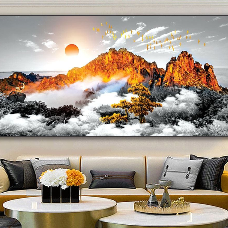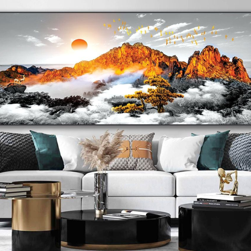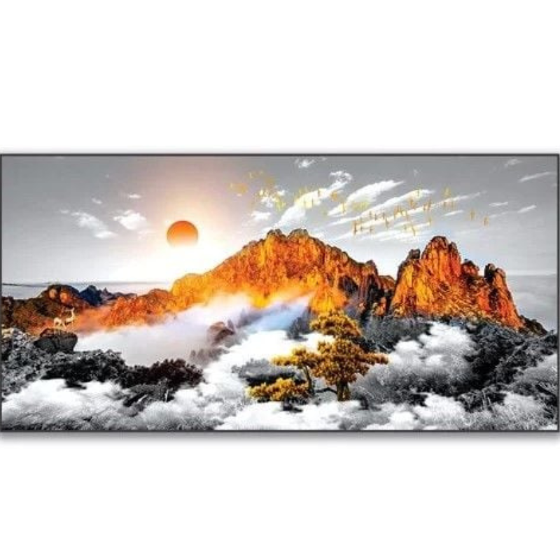 Tranh 3D treo tường phong cảnh thiên nhiên tái hiện khung cảnh núi non hùng vĩ trong ánh hoàng hôn rực rỡ, tạo hiệu ứng chiều sâu sống động giúp không gian trở nên sang trọng và cuốn hút. Hình ảnh mây núi, ánh nắng và đàn chim bay mang lại cảm giác thư thái, gần gũi với thiên nhiên. Tranh được in công nghệ UV sắc nét trên chất liệu cao cấp, màu sắc bền đẹp, chống phai màu theo thời gian. Khung hợp kim titan đen chắc chắn, hiện đại, giúp tổng thể bức tranh thêm tinh tế và phù hợp với nhiều phong cách nội thất như phòng khách, phòng làm việc hoặc sảnh trang trí.