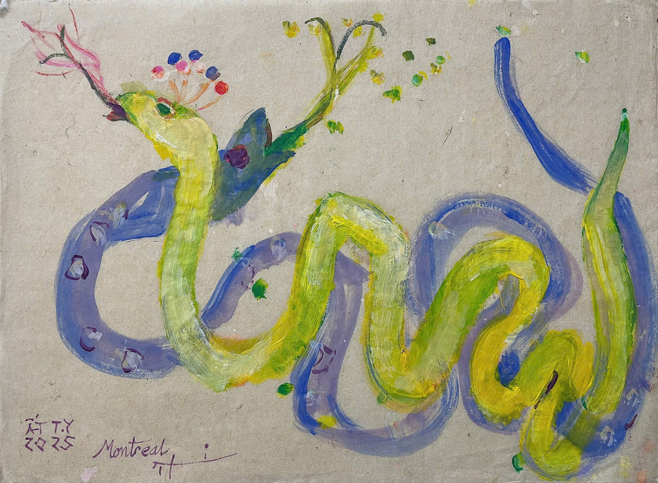 Series “Rắn Ất Tỵ” sáng tác năm 2025 là cuộc dạo chơi đầy ngẫu hứng giữa ngôn ngữ biểu hiện đương đại và tinh thần dân gian. Thay vì tả thực, họa sĩ giải phóng hình tượng linh vật qua những đường cong uốn lượn kịch tính, cuộn xoắn tự do trên nền giấy thủ công thô mộc.