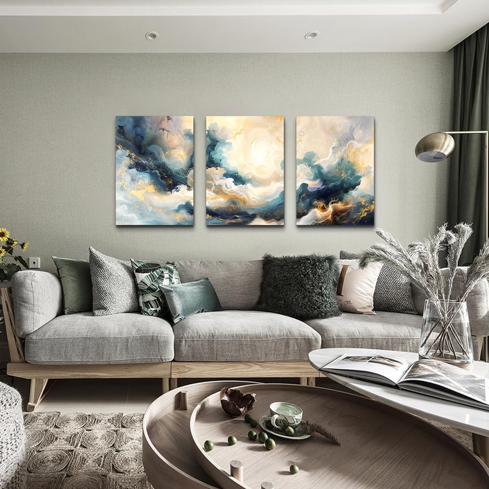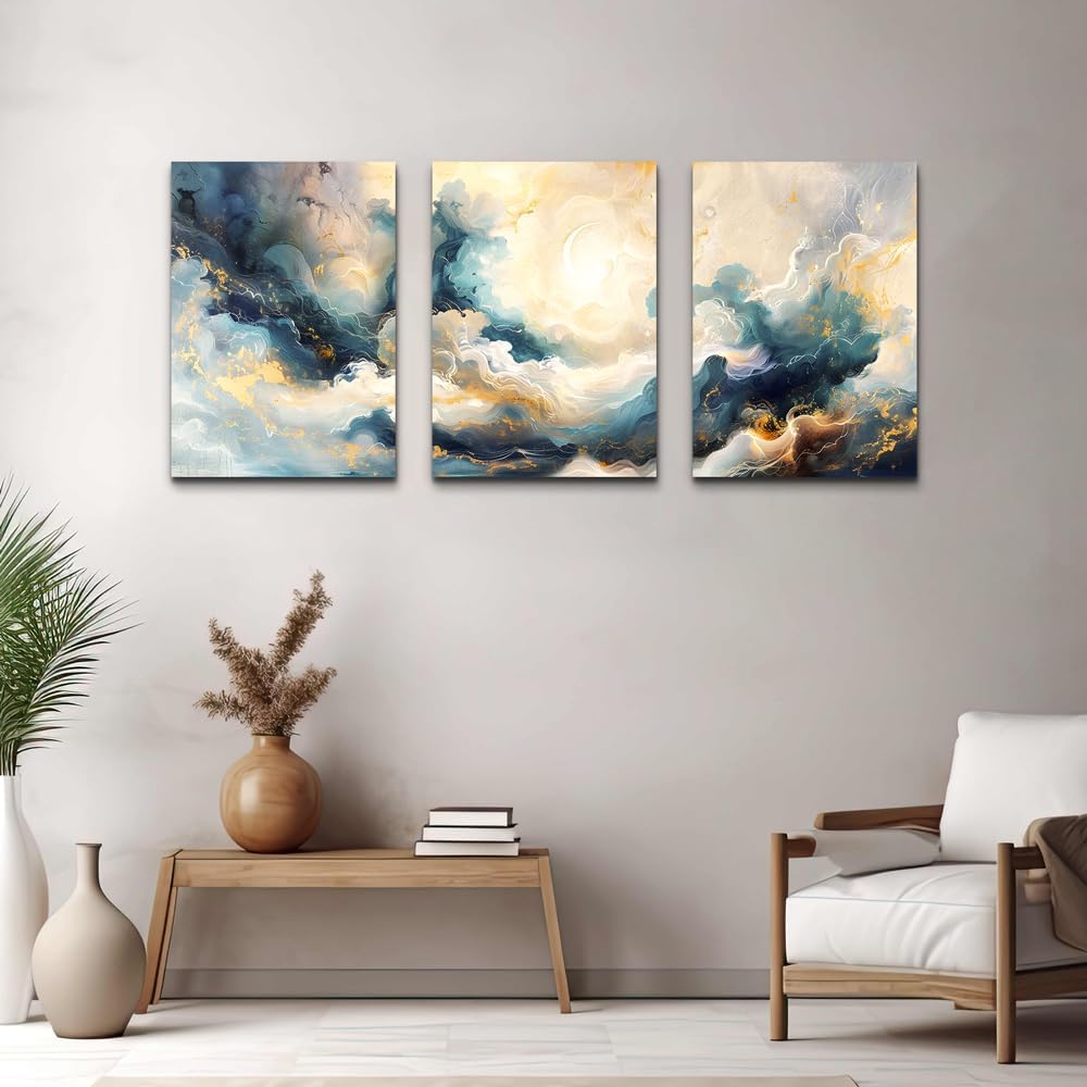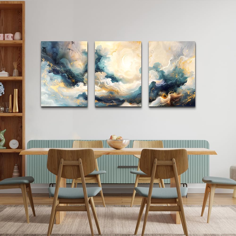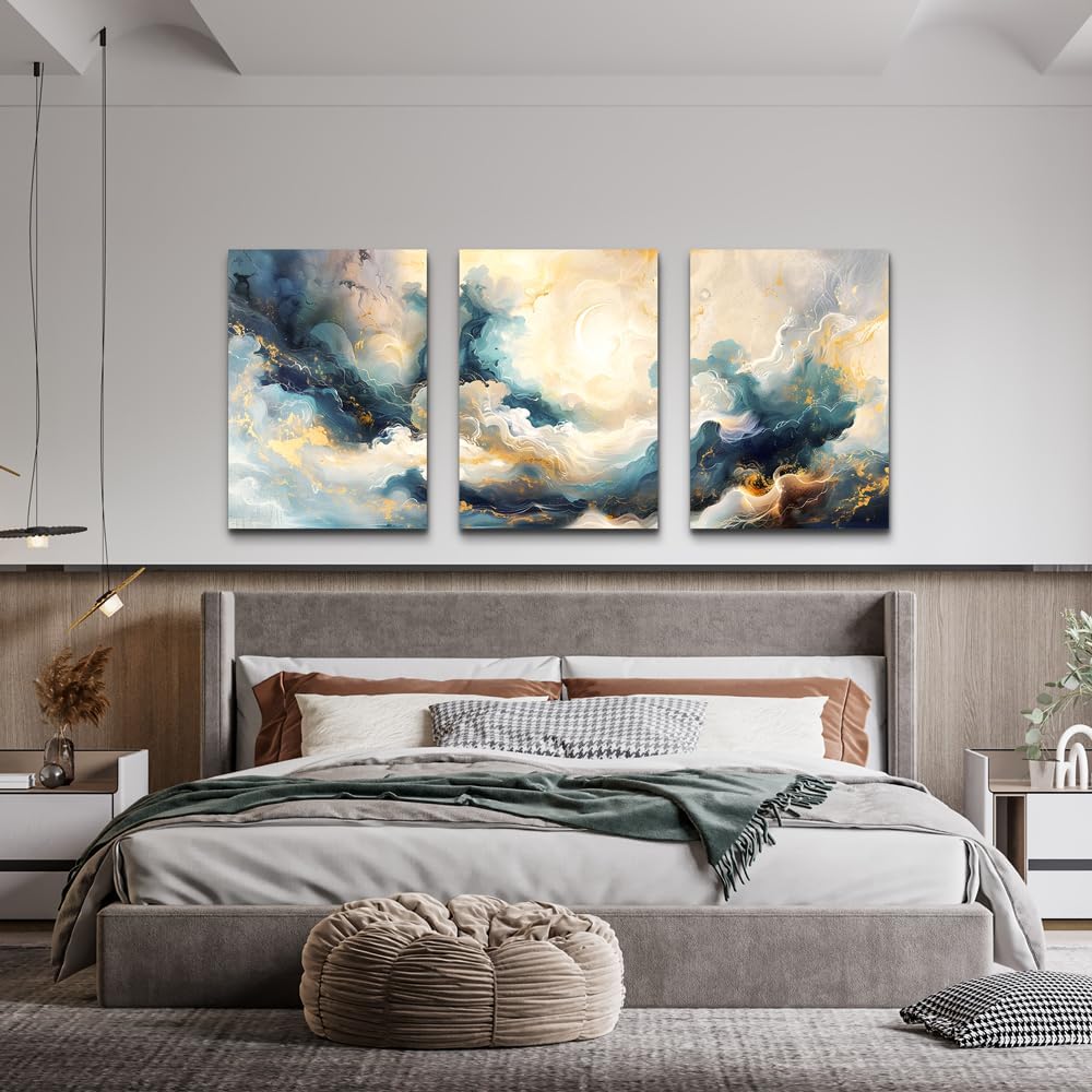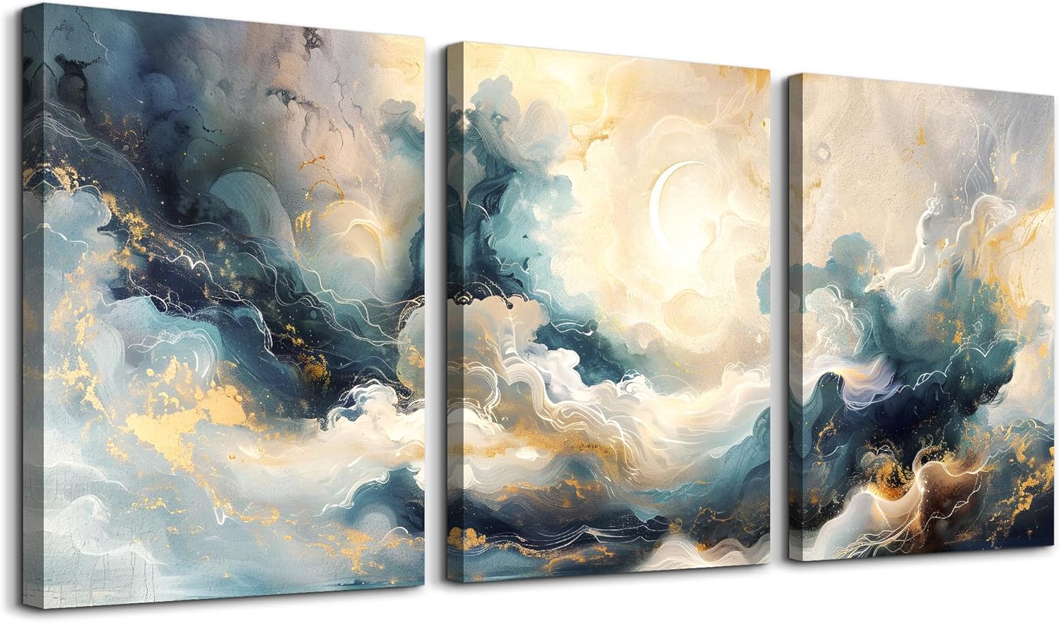 Hòa mình vào không gian bình yên với bộ tranh canvas 3 tấm trừu tượng kết hợp nét vàng kim sang trọng trên nền mây và trăng khuyết, lý tưởng cho decor phòng ngủ.
