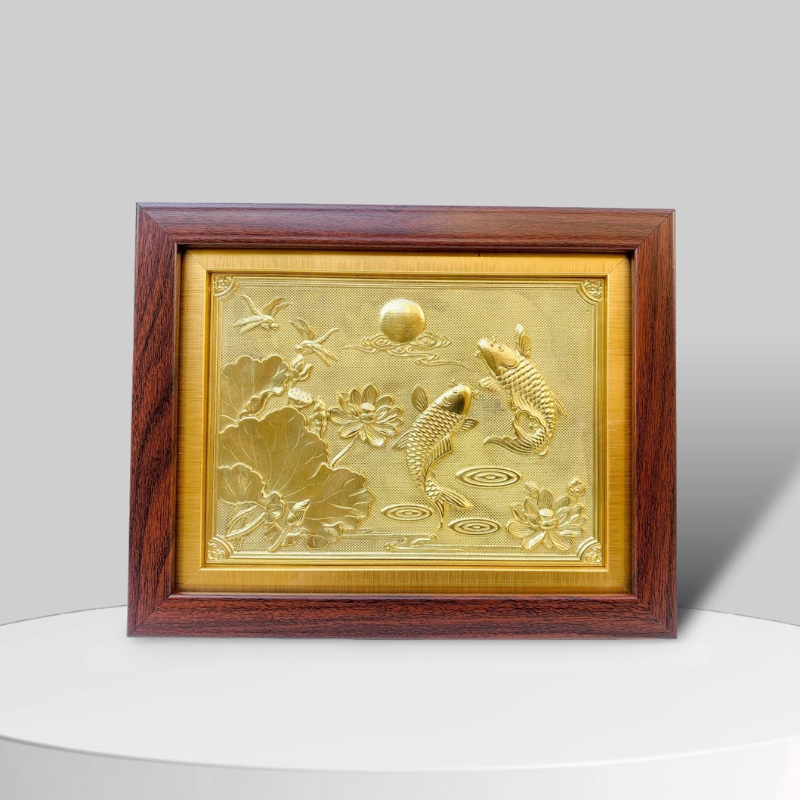 Bức tranh cá chép hoa sen “Song Ngư Cát Hạnh” nổi bật với vẻ đẹp sang trọng và tinh xảo, được chế tác với tông vàng rực rỡ trên nền họa tiết chạm nổi tinh tế. Hình ảnh hai chú cá chép đang bơi lượn uyển chuyển giữa hồ sen thanh bình, bên cạnh những đóa hoa sen nở rộ và lá sen mềm mại. Ánh vàng nổi bật kết hợp cùng khung gỗ nâu trầm tạo nên tổng thể hài hòa, vừa trang nhã vừa mang phong cách sang trọng cho không gian trưng bày.