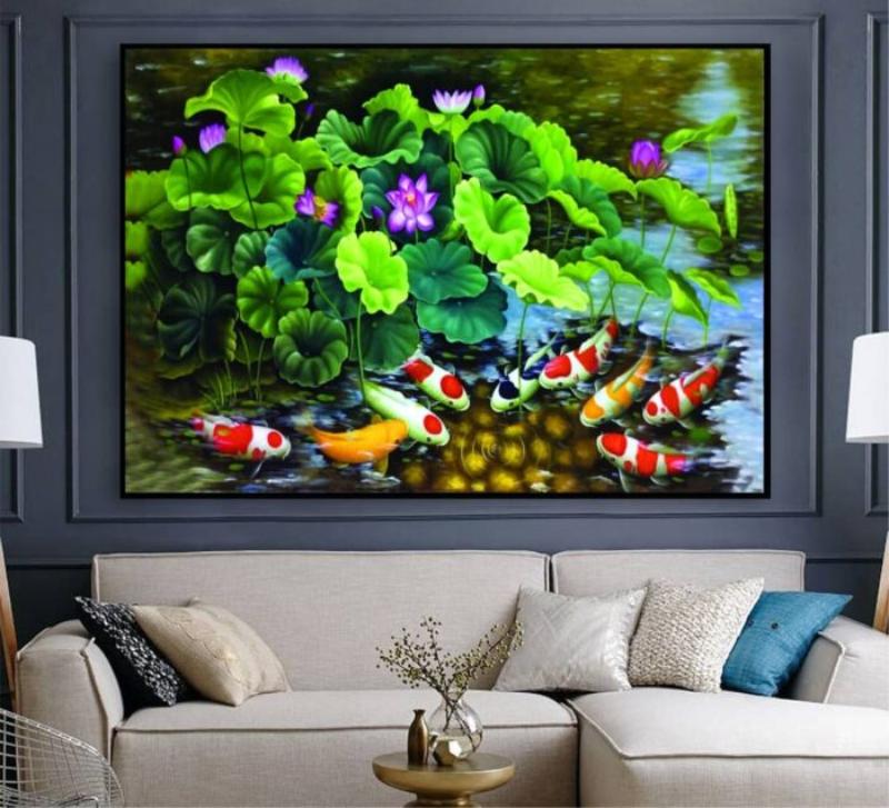 Tổng thể bức tranh mang ý nghĩa phong thủy tốt đẹp, bởi hình ảnh cá chép và hoa sen thường tượng trưng cho sự may mắn, thịnh vượng và thanh cao. Khi được treo trong không gian phòng khách, tác phẩm không chỉ tạo điểm nhấn nghệ thuật nổi bật mà còn mang đến cảm giác hài hòa, thư thái và gần gũi với thiên nhiên. Đây là lựa chọn lý tưởng cho những ai yêu thích vẻ đẹp truyền thống kết hợp với sự sinh động của nghệ thuật trang trí.