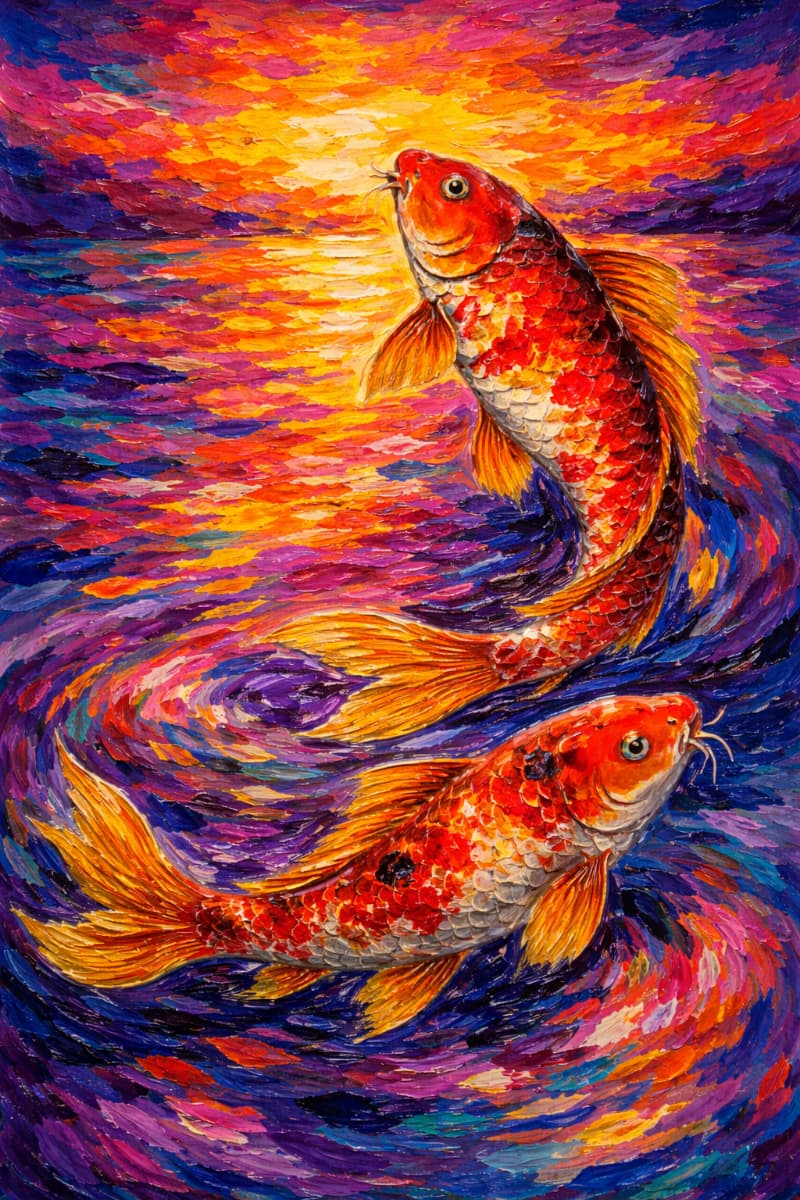 Tranh Cá Chép Hoàng Hôn Phong Cách Sơn Dầu