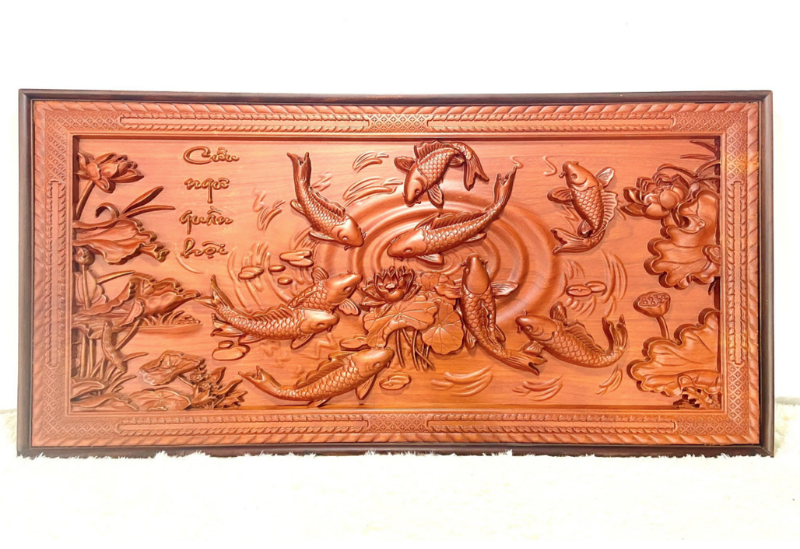 Điểm nổi bật nằm ở kỹ thuật chạm khắc thủ công tinh xảo, tái hiện hình ảnh 9 chú cá chép sống động, từng đường nét mềm mại, có chiều sâu rõ rệt. Bề mặt được xử lý kỹ lưỡng, mịn đẹp, giữ nguyên nét tự nhiên của gỗ.
