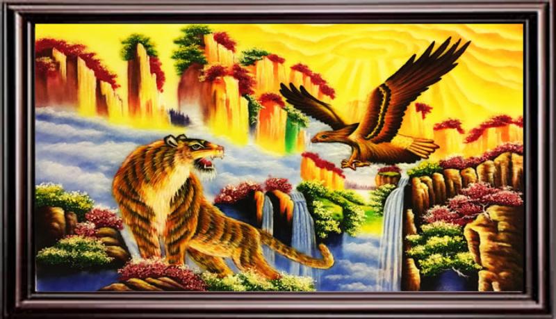 Bức tranh tượng trưng cho sự hội ngộ của hai thế lực tối cao: Hổ là chúa tể mặt đất đại diện cho sức mạnh uy quyền, còn Đại bàng là chúa tể bầu trời đại diện cho tầm nhìn xa trông rộng. Việc treo bức tranh này giúp gia chủ trấn trạch, xua đuổi tà khí, đồng thời kích hoạt dương khí mạnh mẽ để thu hút tài lộc, sự thăng tiến và củng cố vị thế lãnh đạo.