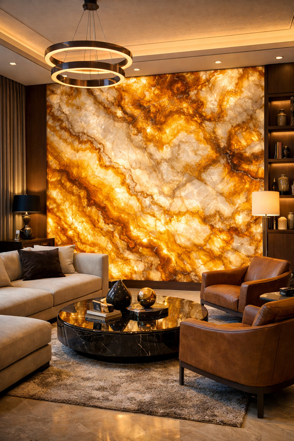 Bức tranh đá xuyên sáng từ đá thạch anh tự nhiên mang sắc vàng hổ phách ấm áp, vân đá cuộn chảy đầy nghệ thuật. Khi kết hợp hệ đèn LED phía sau, bề mặt đá phát sáng sang trọng, tạo điểm nhấn nổi bật cho phòng khách, sảnh tiếp khách hay không gian nội thất cao cấp sang trọng.