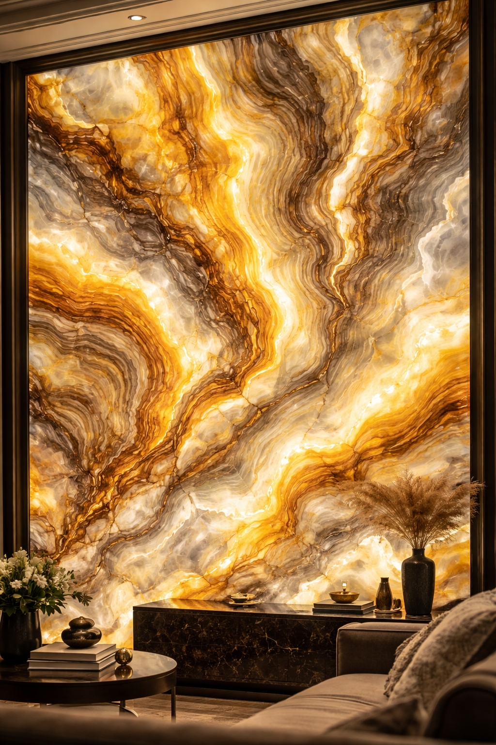 Bức tranh đá xuyên sáng vân onyx nổi bật với những dải màu vàng hổ phách hòa quyện cùng vân đá tự nhiên uốn lượn đầy nghệ thuật. Khi kết hợp hệ thống đèn LED phía sau, bề mặt đá phát sáng ấm áp, tạo điểm nhấn sang trọng cho phòng khách, sảnh hoặc không gian nội thất cao cấp. Đây là lựa chọn hoàn hảo cho thiết kế hiện đại và đẳng cấp.