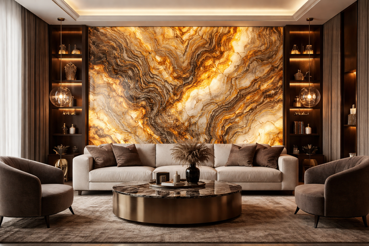 Bức tranh đá xuyên sáng Onyx nổi bật với những đường vân tự nhiên uốn lượn đầy nghệ thuật, hòa quyện sắc vàng – nâu sang trọng. Khi kết hợp hệ thống đèn nền, bề mặt đá tỏa ánh sáng ấm áp, tạo điểm nhấn đẳng cấp cho không gian phòng khách, sảnh lớn hoặc nội thất cao cấp. Đây là lựa chọn hoàn hảo cho thiết kế hiện đại.