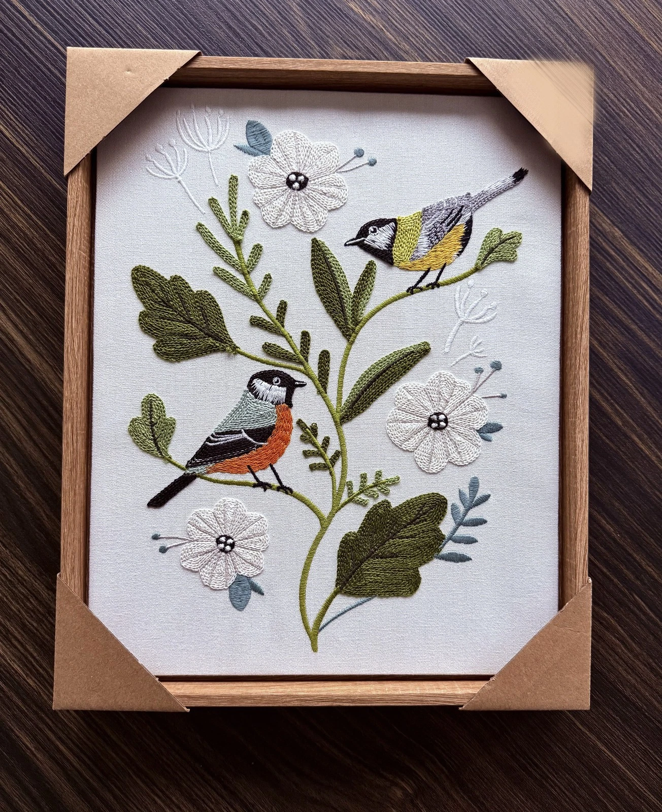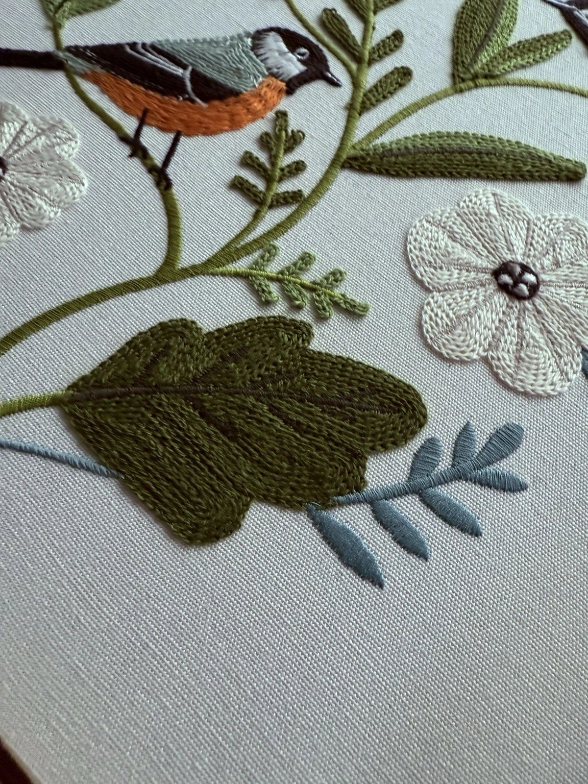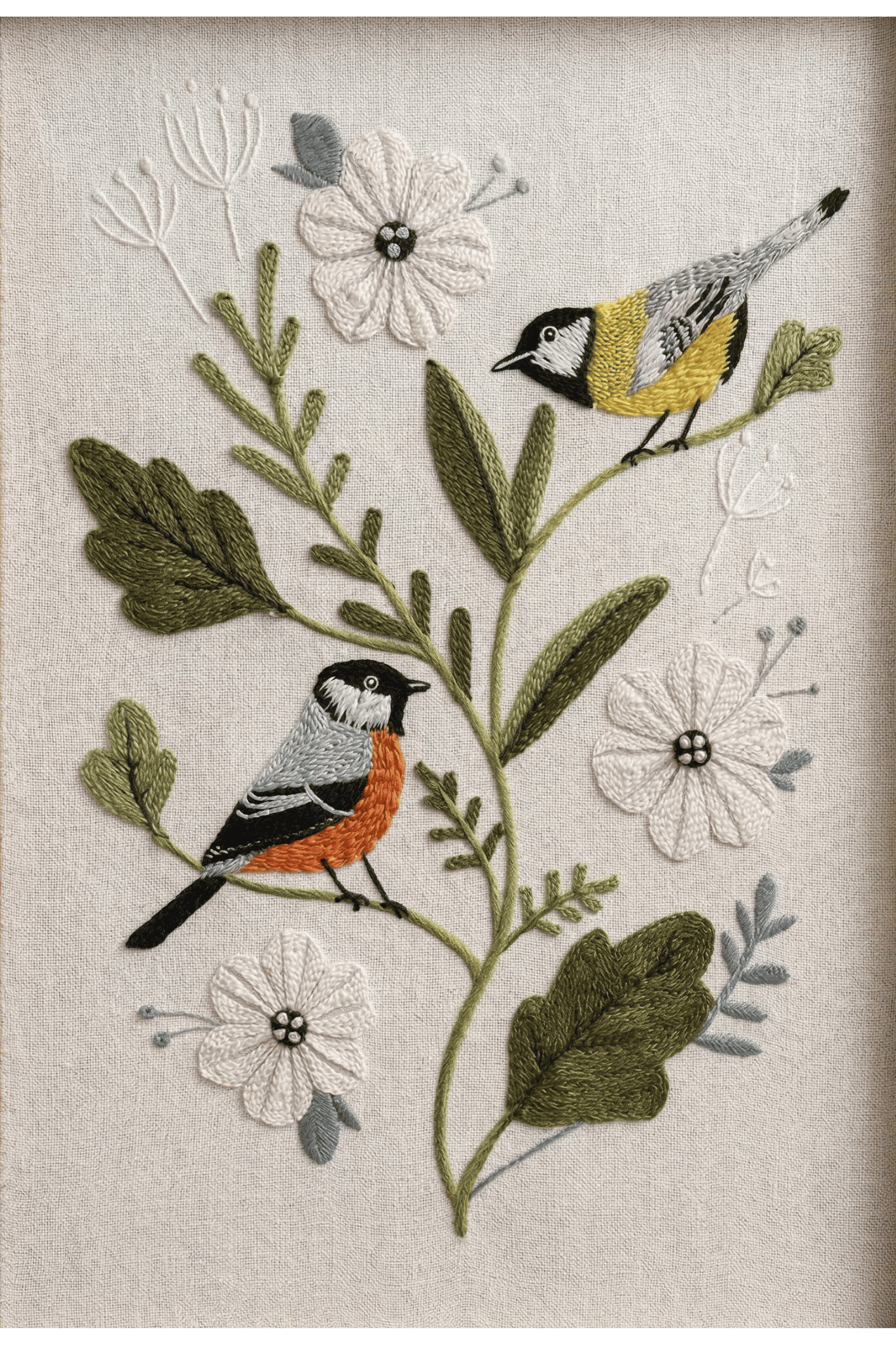 Tác phẩm thêu tay họa lại giai điệu mùa xuân. Từng mũi đâm xô bằng chỉ cotton mượt mà trên nền linen mộc làm đôi chim nhỏ bừng sức sống, mang đến một góc an yên, thư thái.