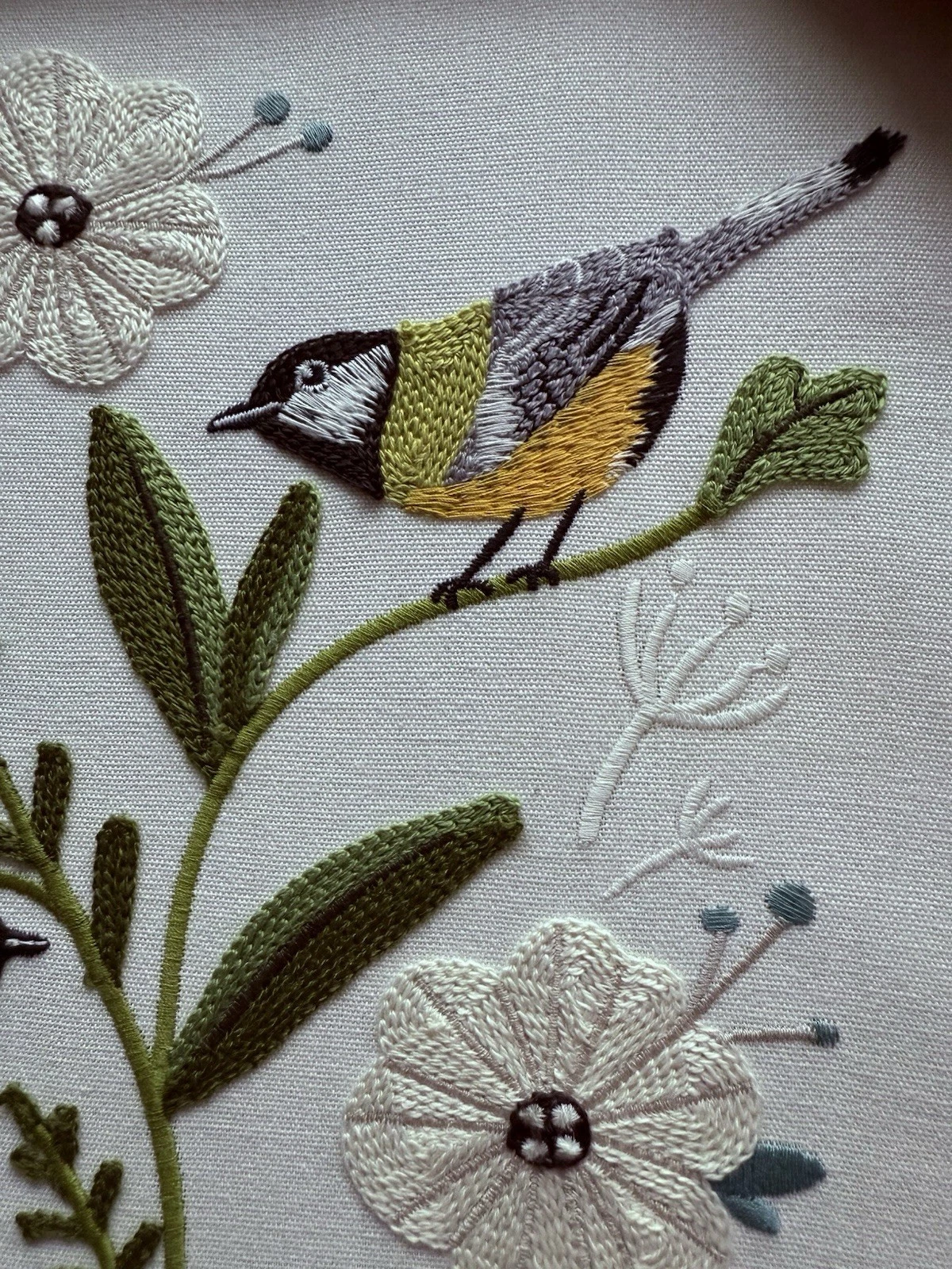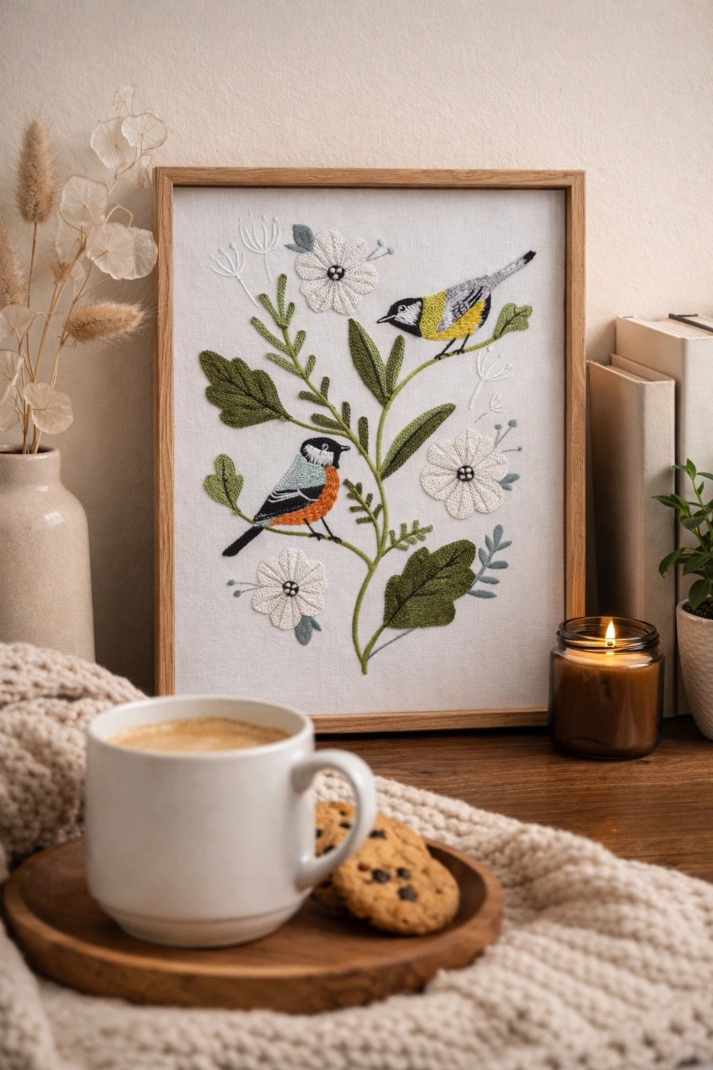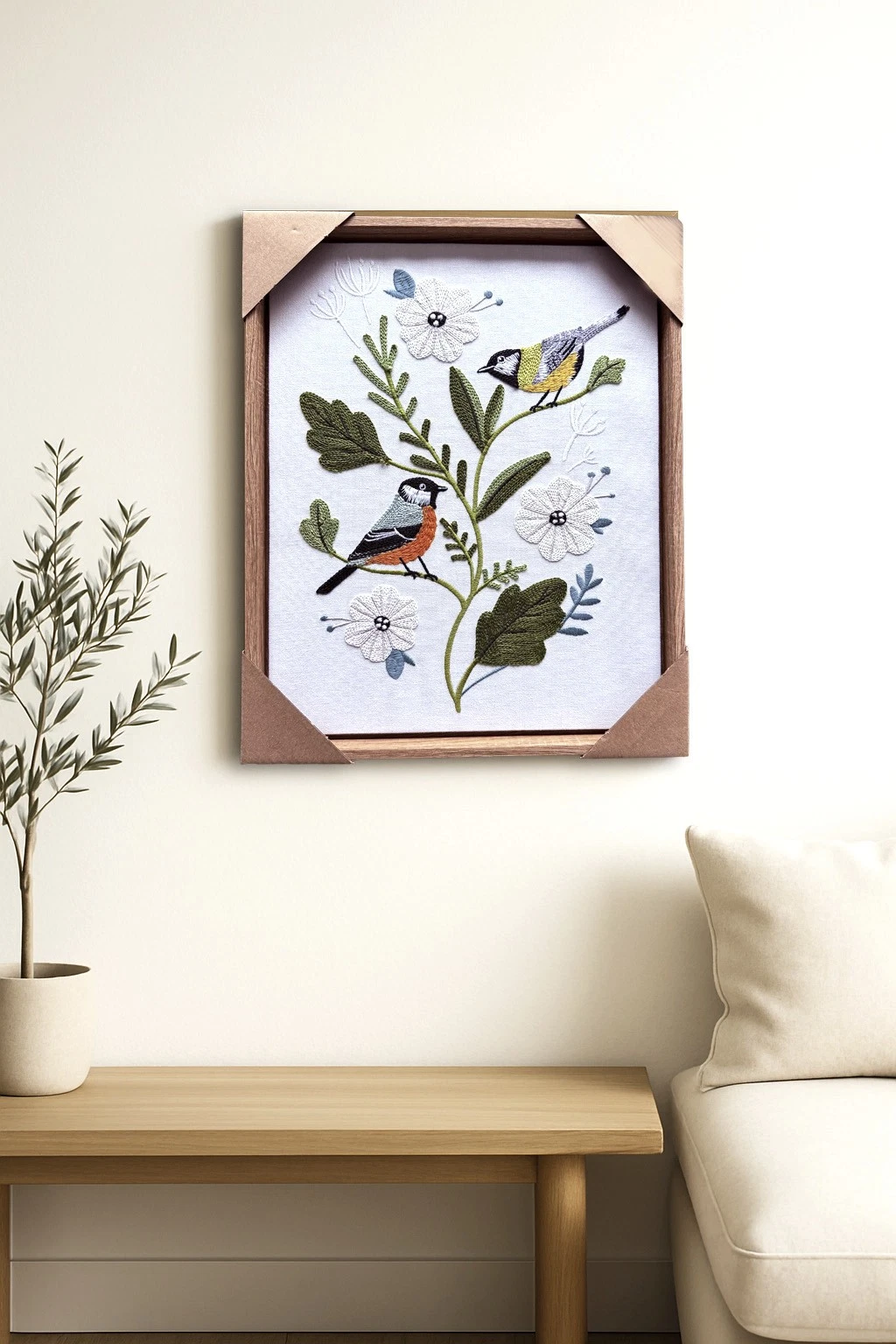 Tác phẩm thêu tay họa lại giai điệu mùa xuân. Từng mũi đâm xô bằng chỉ cotton mượt mà trên nền linen mộc làm đôi chim nhỏ bừng sức sống, mang đến một góc an yên, thư thái.