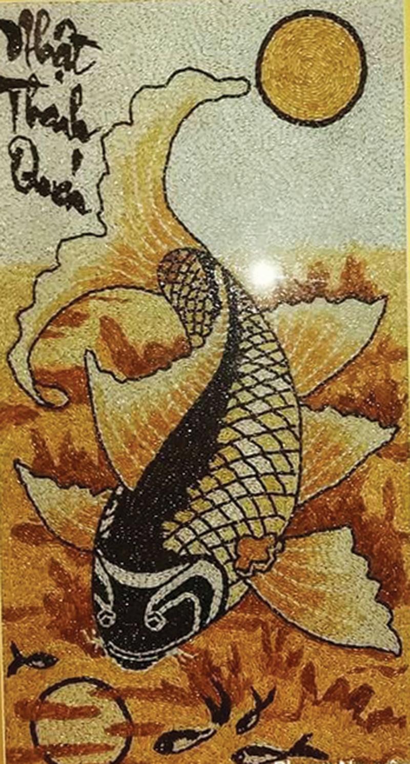 Điểm dễ nhận ra ở bức tranh này là bề mặt có hiệu ứng hạt đặc trưng, các lớp màu không phẳng lì như tranh in mà có độ gồ, độ dày và cảm giác được tạo nên từ vật liệu tự nhiên. Chính yếu tố đó làm cho tranh có chiều sâu hơn khi nhìn trực tiếp, đồng thời tạo cảm giác chân thật, mộc và giàu giá trị trang trí. Hình ảnh cá chép trong tranh không quá cầu kỳ về chi tiết nhưng vẫn đủ nổi bật nhờ cách xử lý tương phản giữa thân cá, nền tối và hình trăng sáng phía trên.