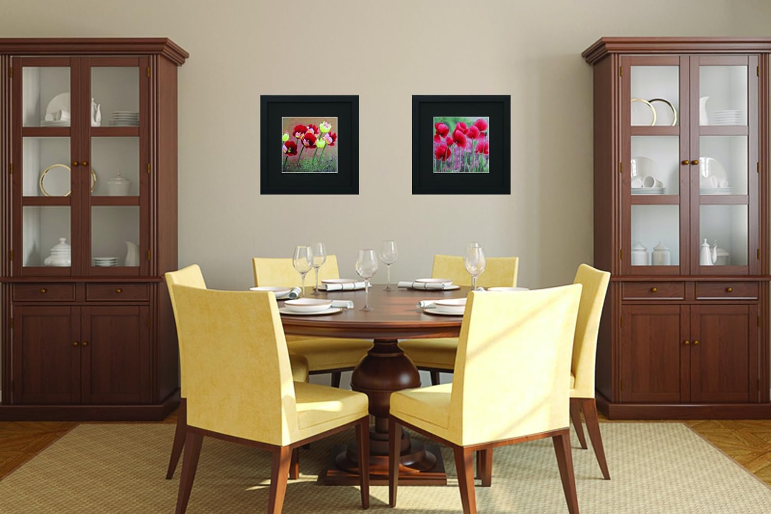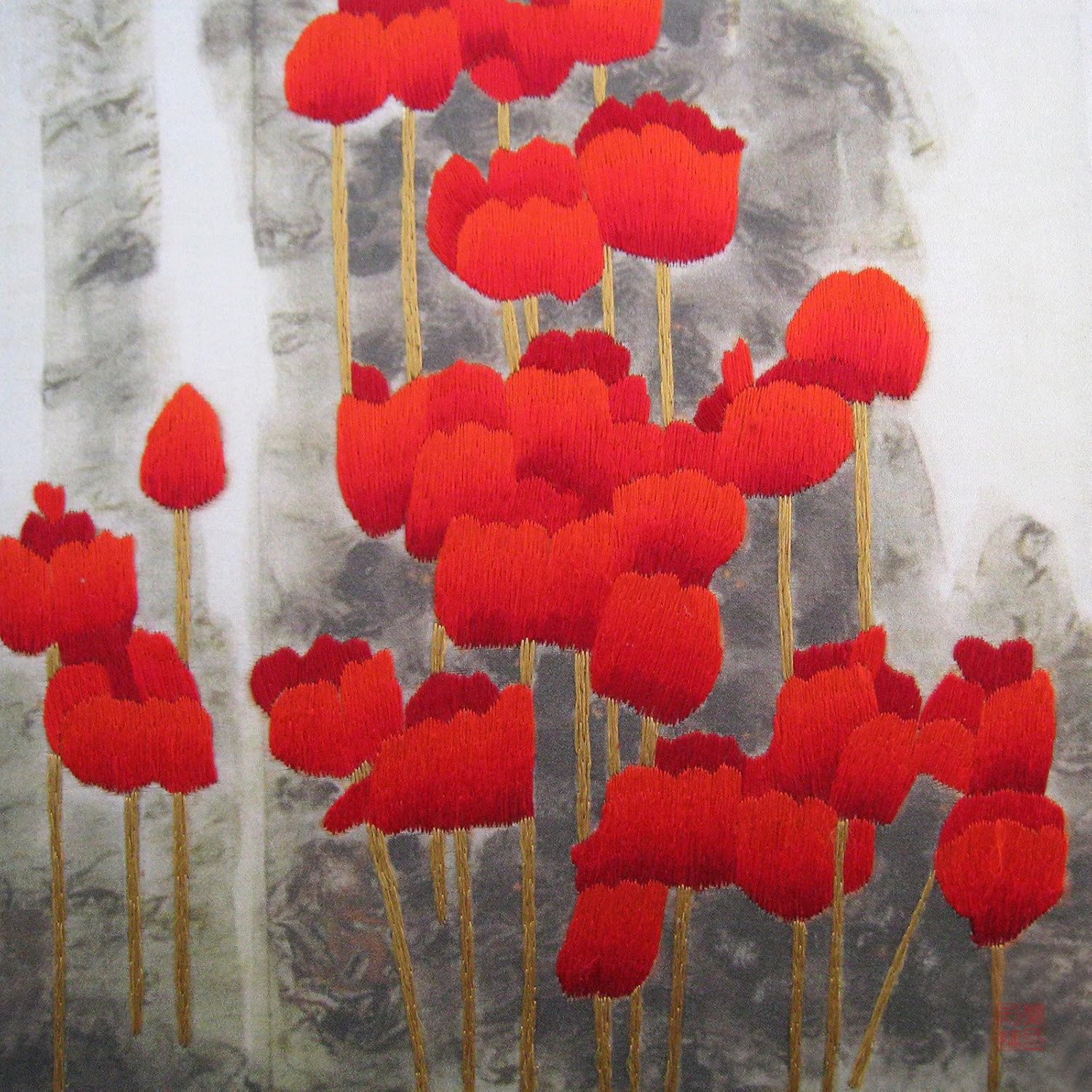 Bức tranh sắc đỏ của khóm hoa anh túc vươn lên kiêu hãnh trên nền xám trừu tượng với mũi thêu tay tạo nét độc đáo cho không gian nội thất.