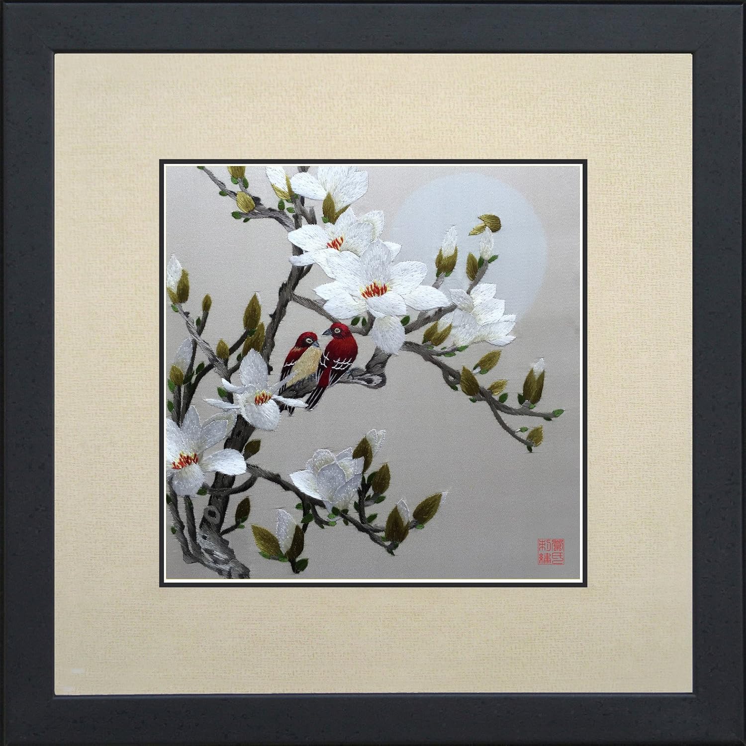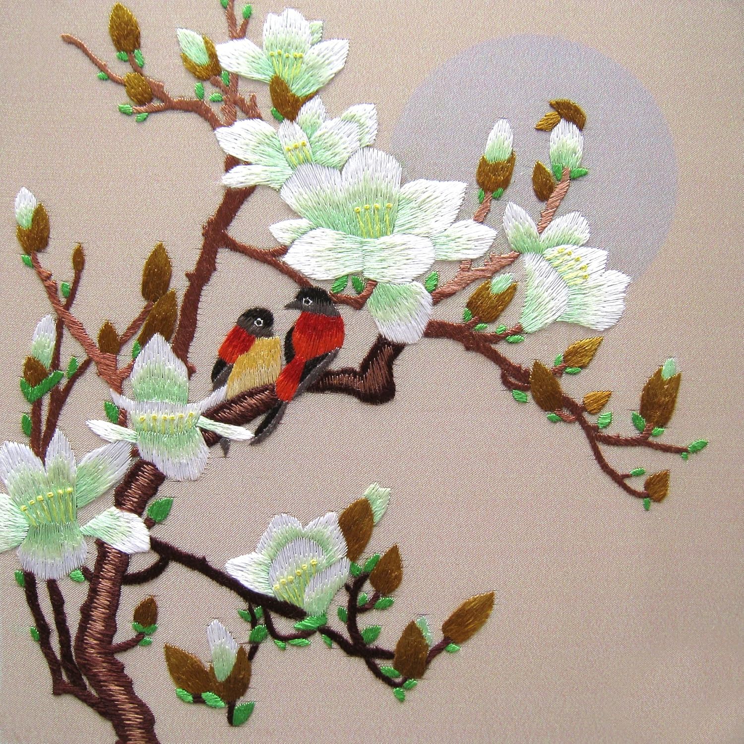 Đôi chim tựa đầu bên nhành mai trắng dưới ánh trăng mờ. Từng mũi chỉ lụa bóng bẩy dệt nên vẻ đẹp tượng trưng cho tình yêu thủy chung, viên mãn.