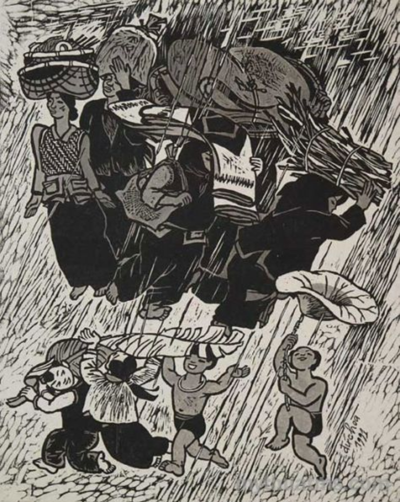 Tranh khắc gỗ chạy mưa tái hiện khoảnh khắc sinh hoạt đời thường đầy cảm xúc qua những đường nét khắc gỗ mộc mạc và giàu tính nghệ thuật. Bức tranh nổi bật với kỹ thuật khắc thủ công tạo chiều sâu rõ nét, các mảng sáng – tối tương phản giúp hình ảnh sống động và giàu cảm xúc.