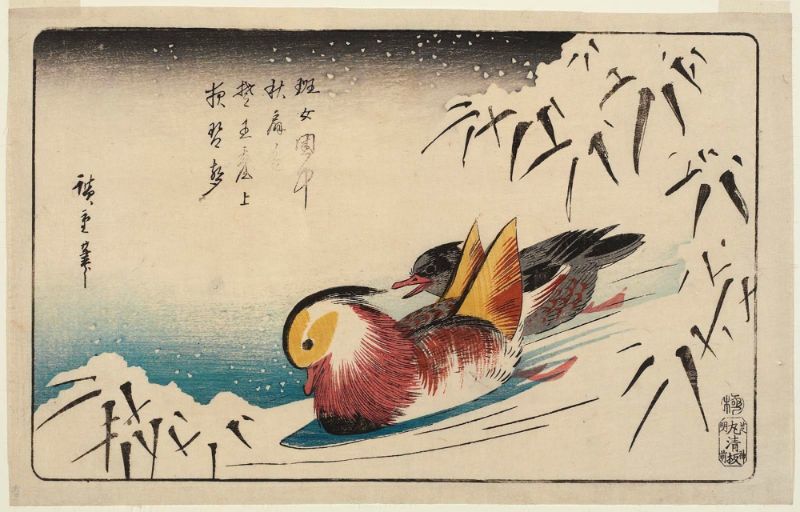 Tranh khắc gỗ Nhật Bản đôi chim uyên ương dưới tuyết nghệ thuật cổ điển
