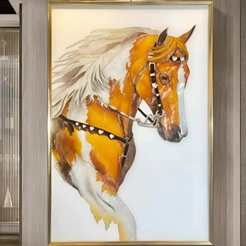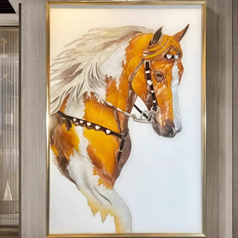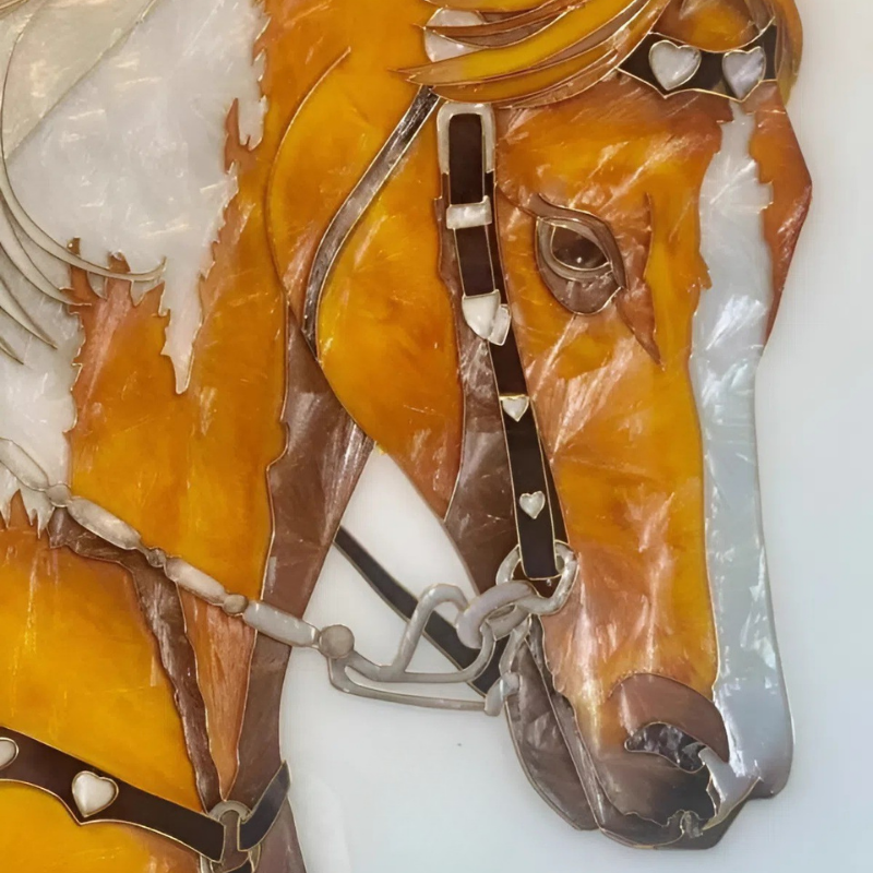 Tranh khảm trai Ngựa Hoàng Gia tái hiện hình ảnh tuấn mã mạnh mẽ, biểu tượng của sức mạnh, tốc độ và sự thành công. Các chi tiết được khảm thủ công từ khảm trai tự nhiên, tạo hiệu ứng ánh xà cừ óng ánh, giúp hình ảnh ngựa trở nên nổi bật và sống động.