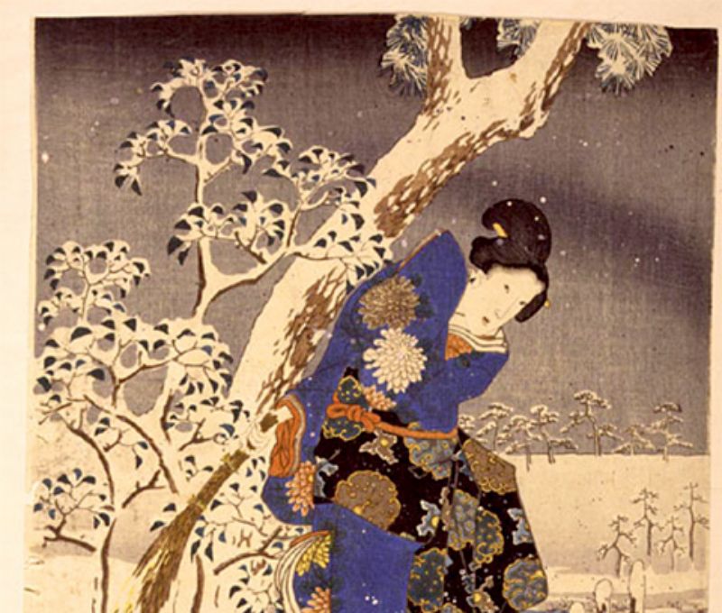 Bức tranh mở ra một khung cảnh mùa thu Nhật Bản tuyệt mỹ với sắc đỏ rực rỡ của lá phong bao quanh ngôi chùa cổ kính bên mặt hồ yên ả.