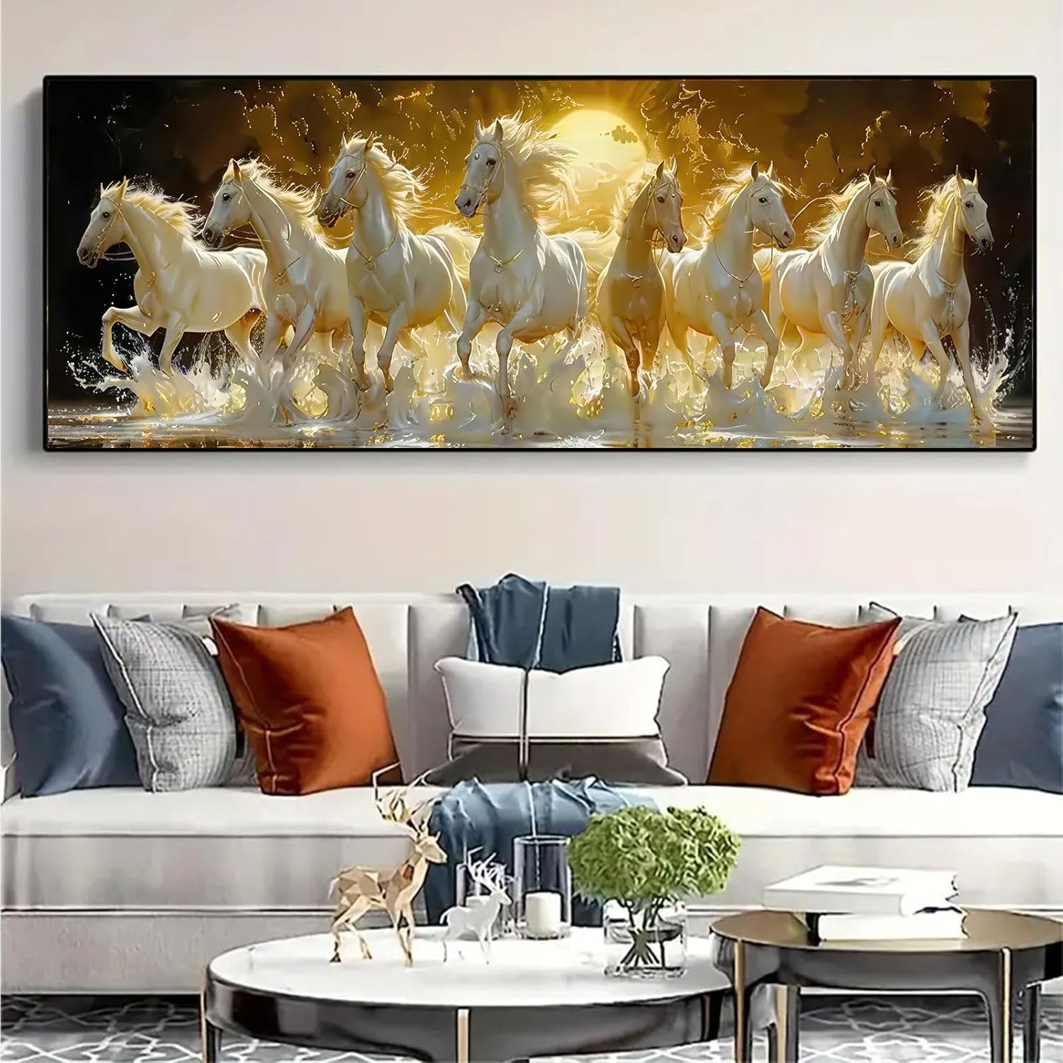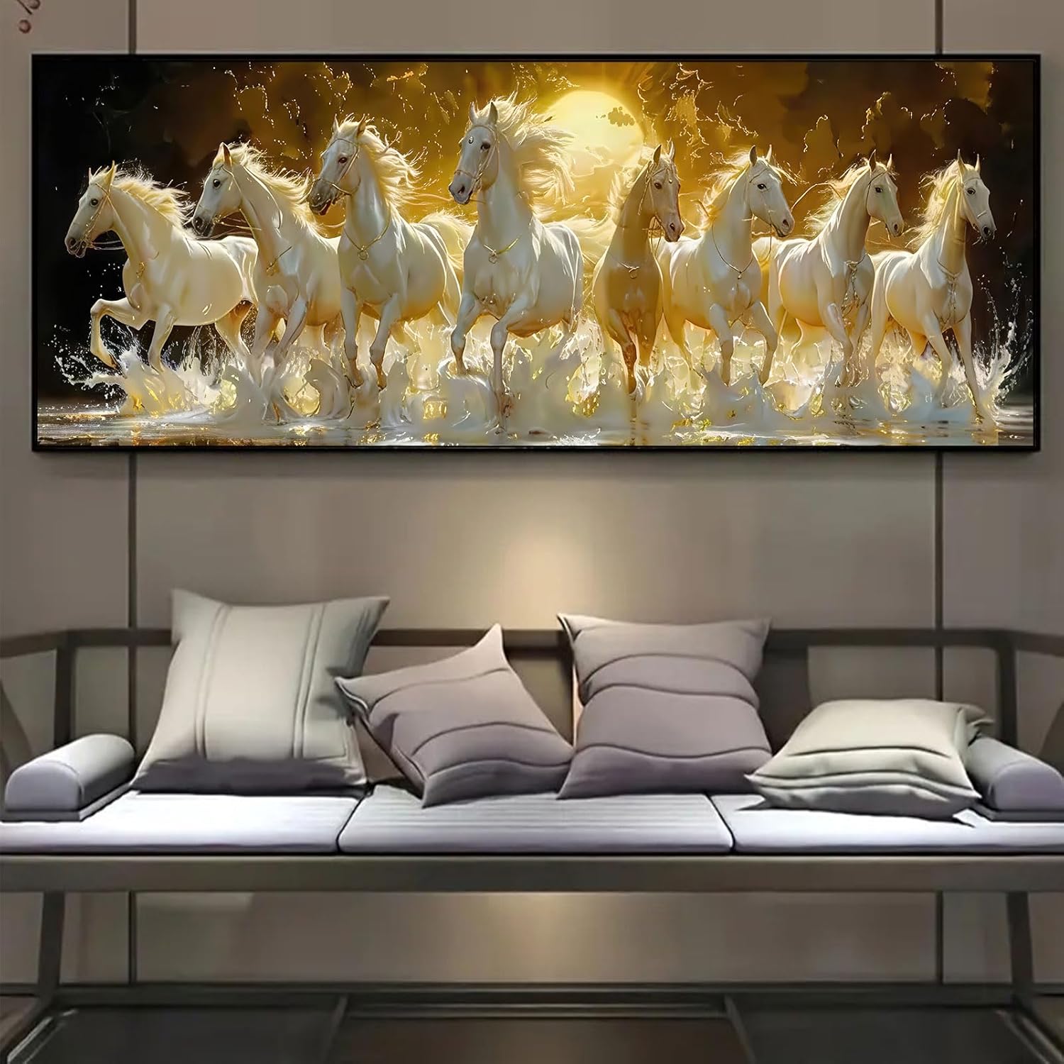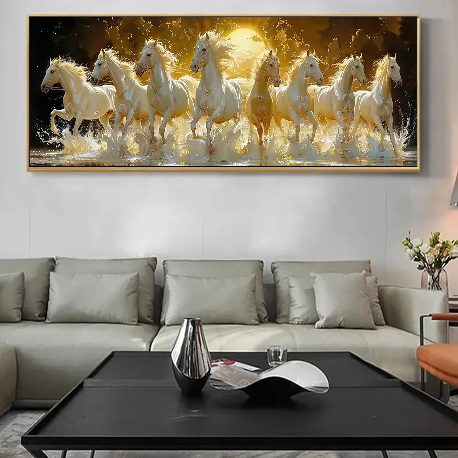 Tám con bạch mã uy nghi rẽ sóng nước vàng kim, một biểu tượng của sự mã đáo thành công tráng lệ là điểm nhấn phong thủy sang trọng cho phòng khách của bạn.