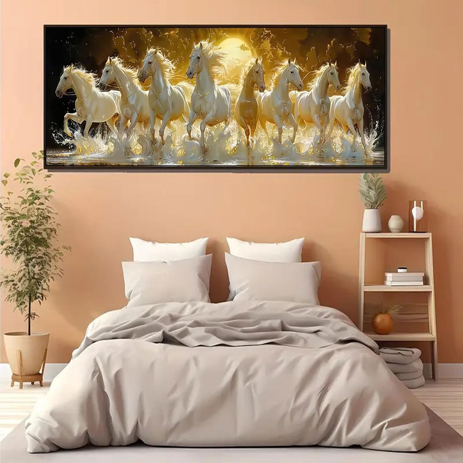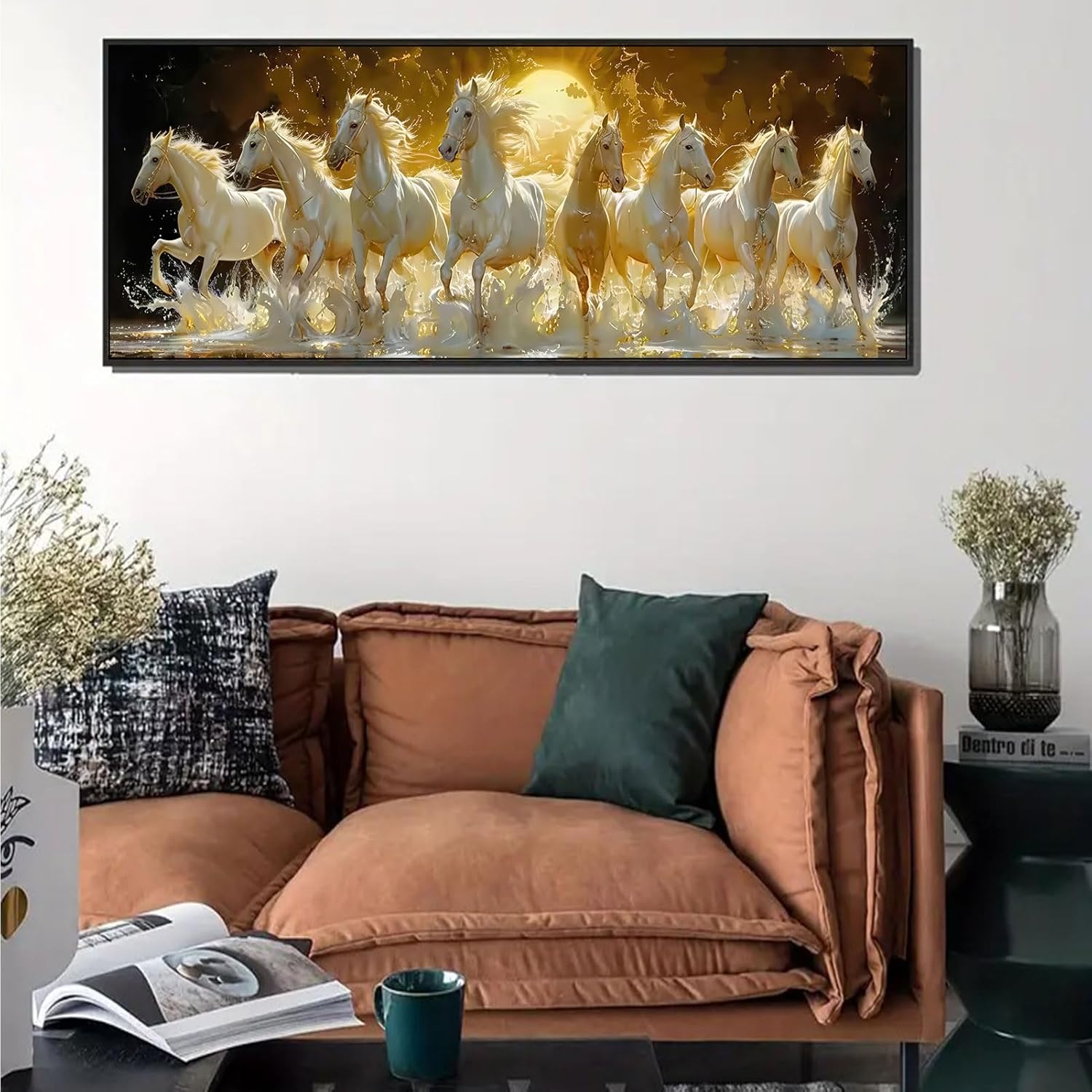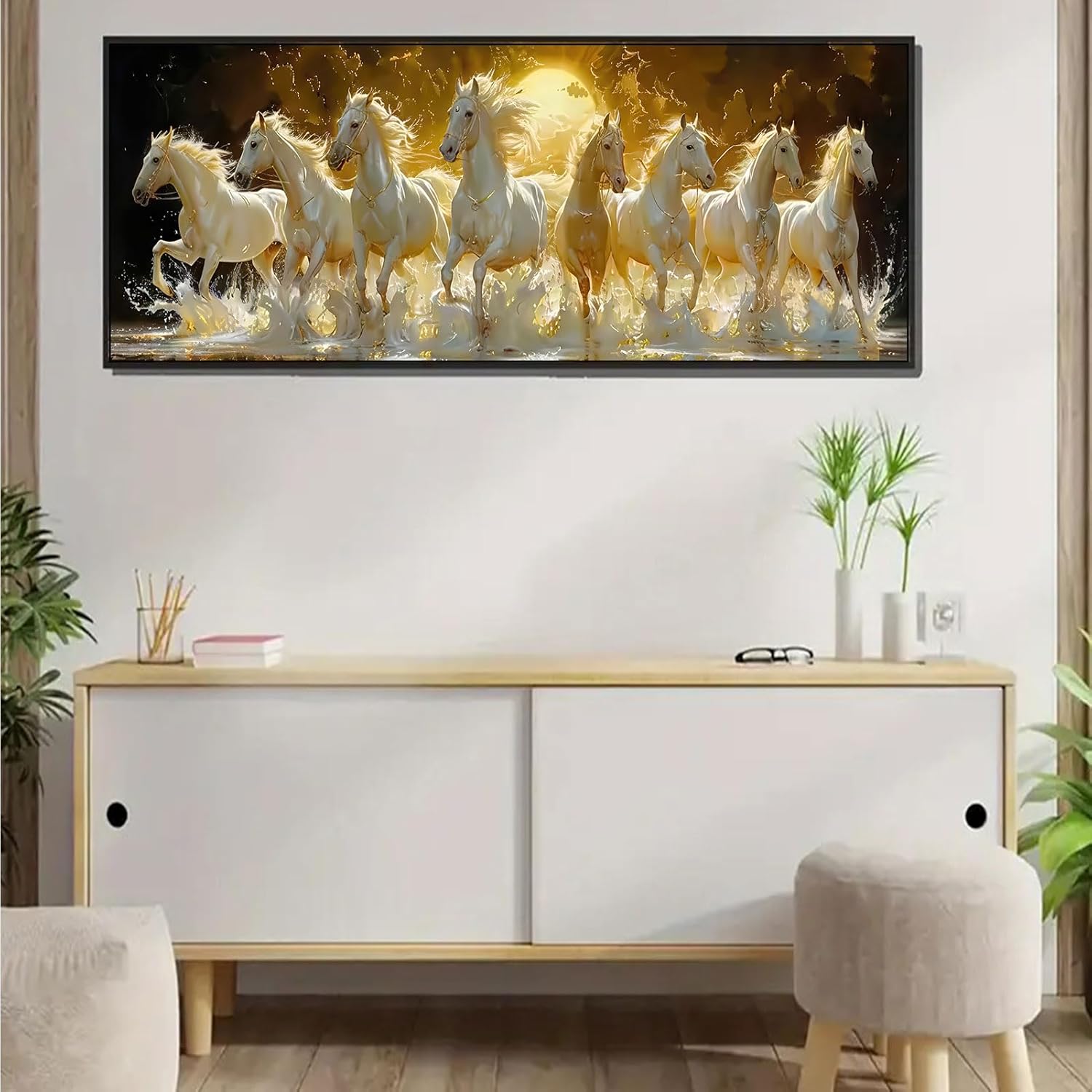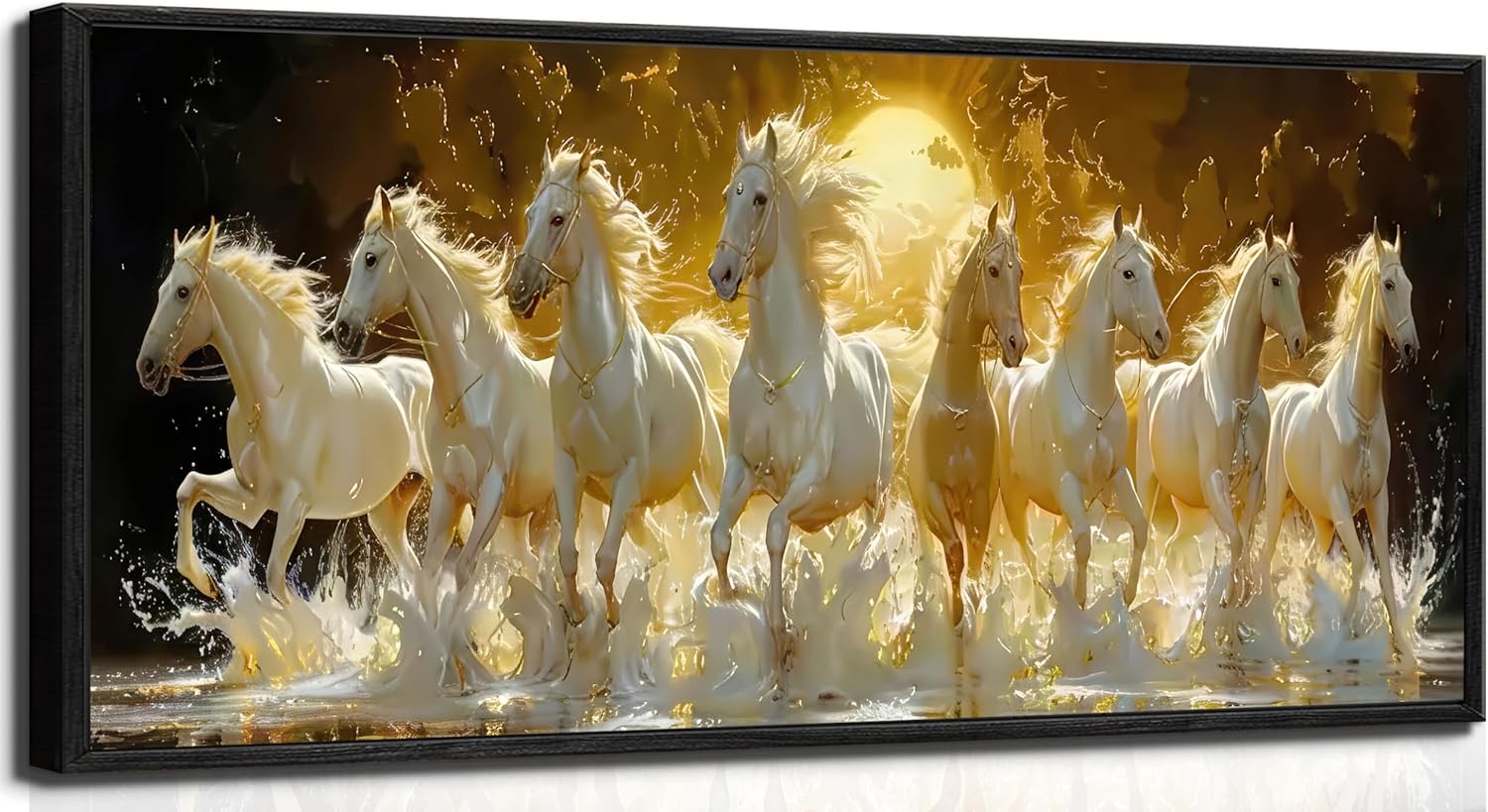 Tám con bạch mã uy nghi rẽ sóng nước vàng kim, một biểu tượng của sự mã đáo thành công tráng lệ là điểm nhấn phong thủy sang trọng cho phòng khách của bạn.