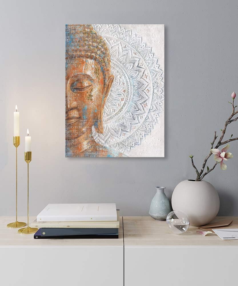 Bức tranh in canvas nửa khuôn mặt Phật nhắm mắt tĩnh lặng mang bề mặt dát vàng nổi bật trên nền họa tiết Mandala trắng mang năng lượng bình an cho phòng thờ.