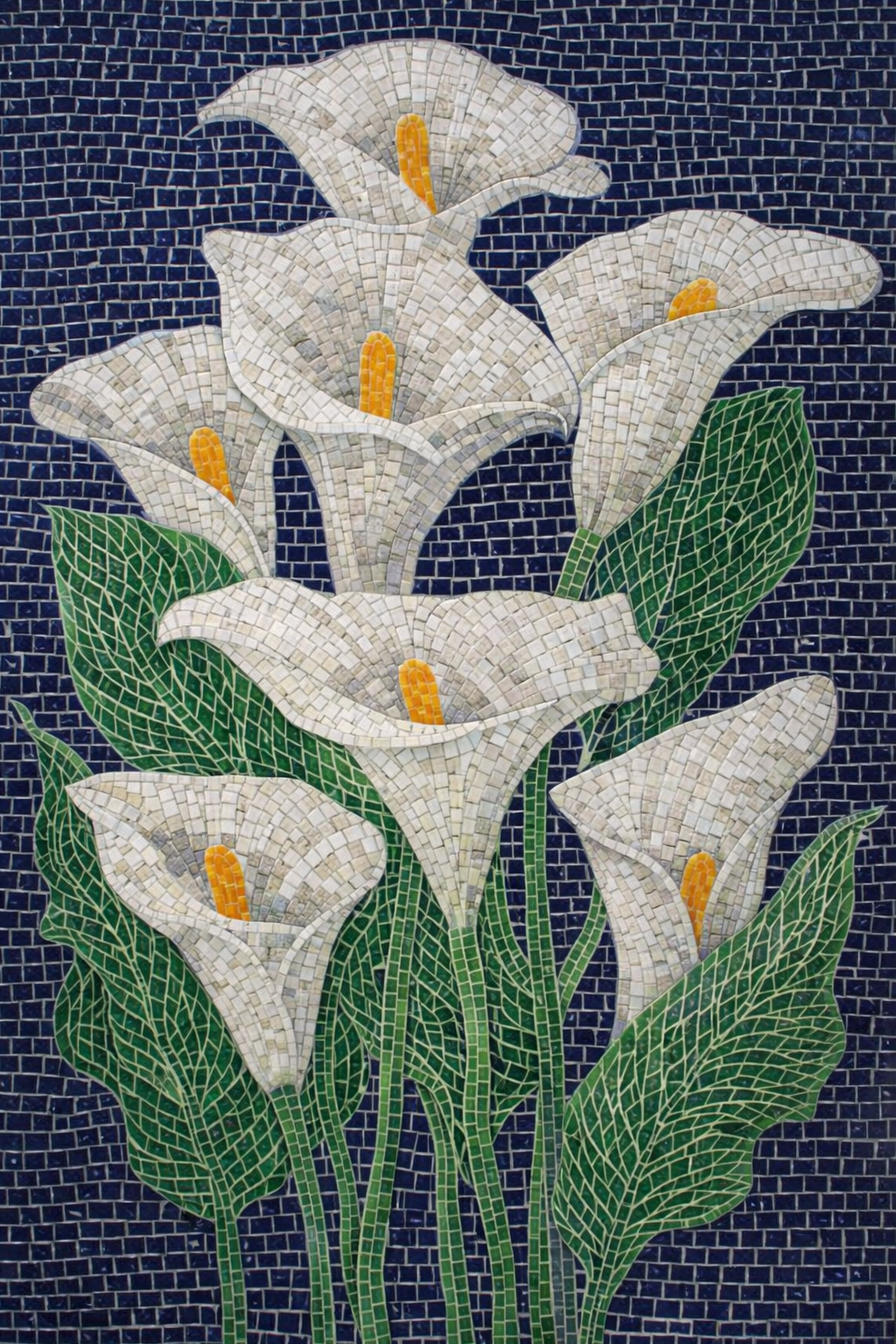 Hoa thường xuân được thể hiện bằng nghệ thuật mosaic với những mảnh gạch nhỏ ghép tỉ mỉ, tạo nên tổng thể hài hòa và nổi bật. Những bông hoa trắng vươn cao, mềm mại trên nền xanh đậm, kết hợp cùng lá xanh uốn lượn mang đến cảm giác tươi mát và tràn đầy sức sống. Điểm nhấn nhụy vàng ấm áp giúp bức tranh trở nên sinh động, không đơn điệu. Tác phẩm không chỉ đẹp về mặt thị giác mà còn gợi lên ý nghĩa của sự bền bỉ, vươn lên và sức sống lâu dài – đúng với tinh thần của loài thường xuân.
