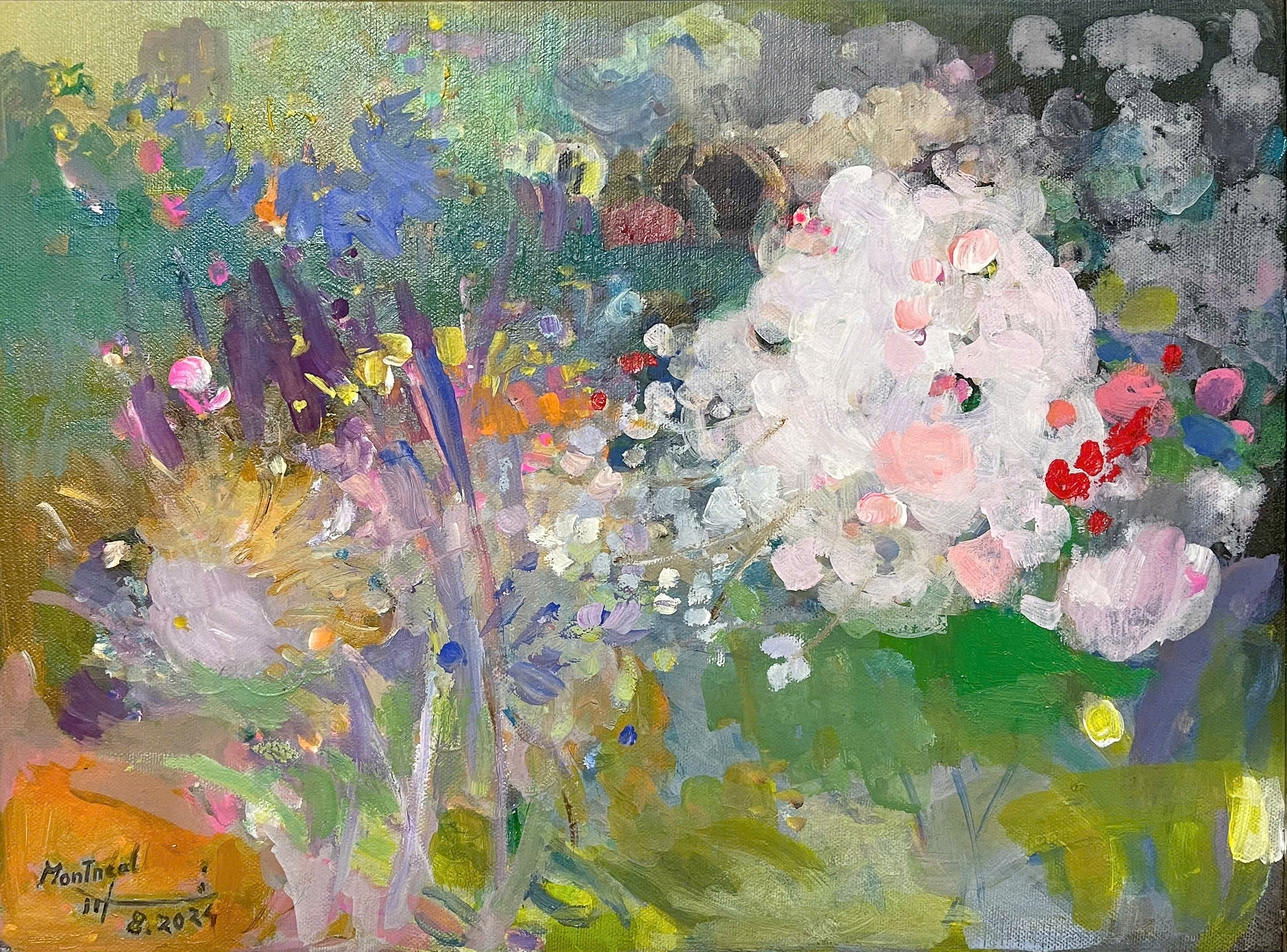 “Ngọc Nhà Trời” sáng tác năm 2024 giàu tính thể nghiệm về vẻ đẹp mong manh và thanh khiết của cỏ hoa. Trung tâm bố cục là những vệt màu trắng muốt như ngọc, giữ vai trò điểm tựa thị giác giữa những mảng màu xanh lá, tím và hồng chồng lớp khéo léo. Các hình khối hòa vào bề mặt tranh như những rung động của ánh sáng, tạo nên một không gian vừa hiện hữu vừa tan biến.