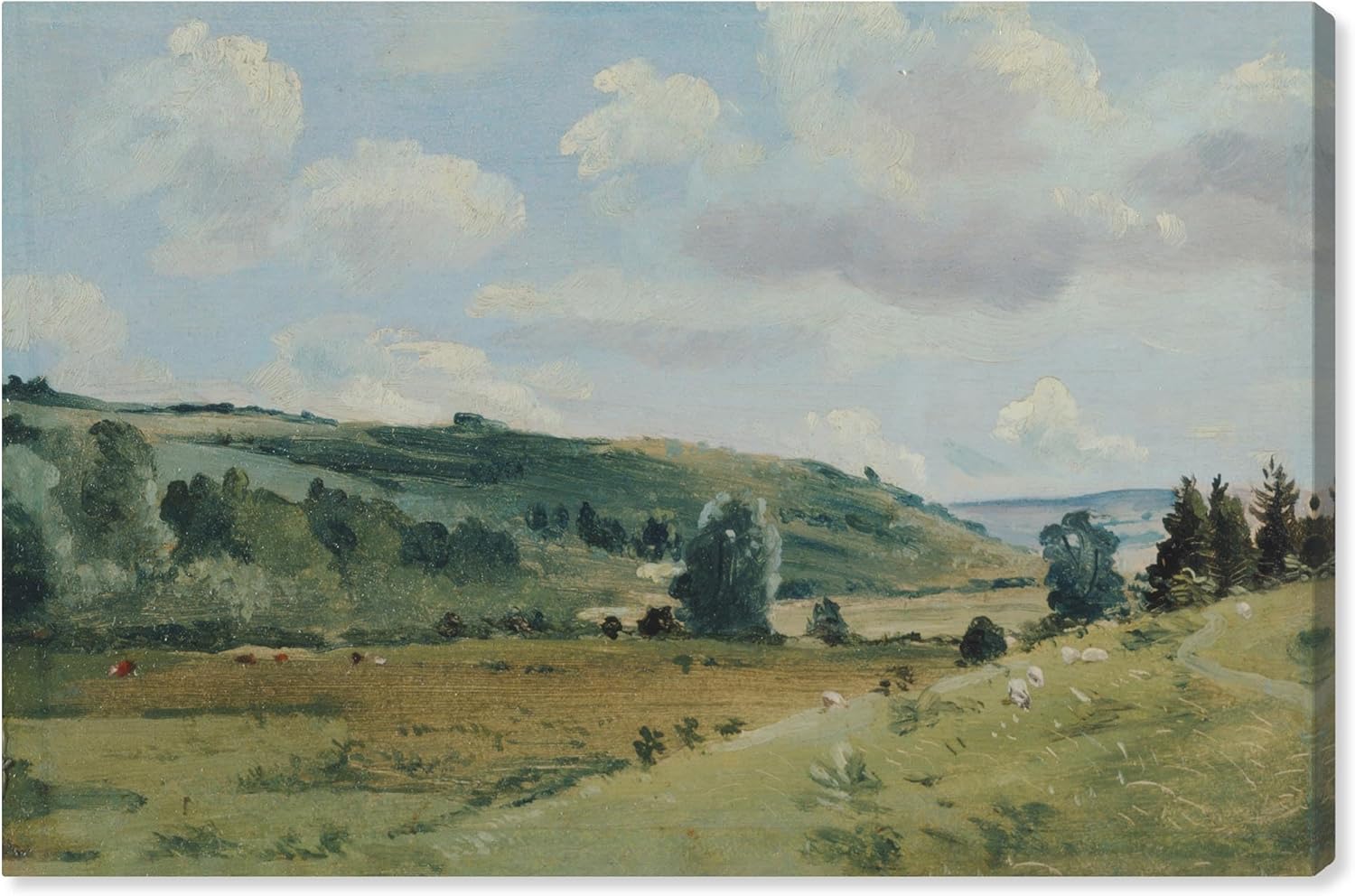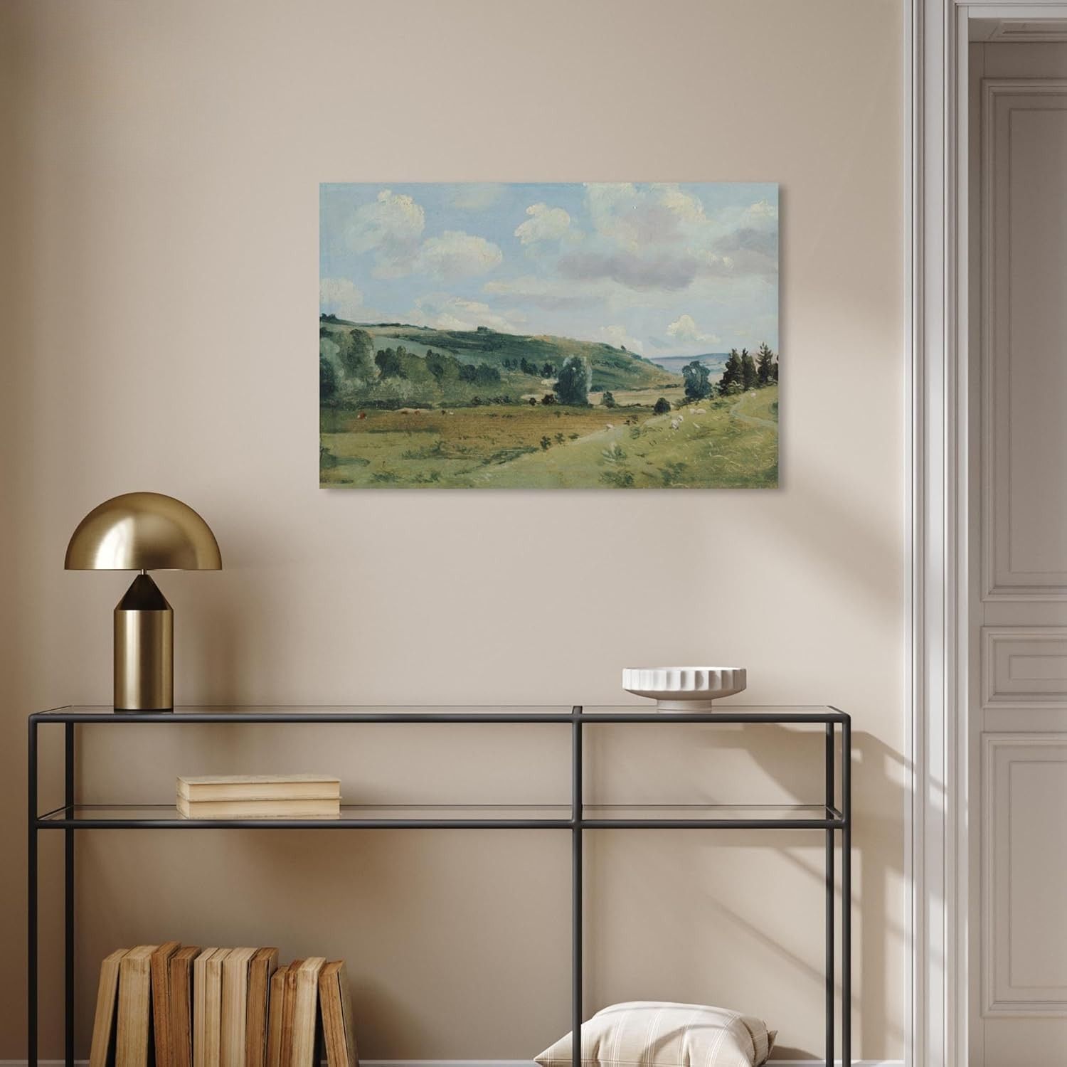 Bức tranh phác thảo cảnh đồi cỏ xanh ngát với đàn cừu trắng gặm cỏ yên bình dưới bầu trời mây tạo điểm nhấn ấm cúng cho không gian sống.
