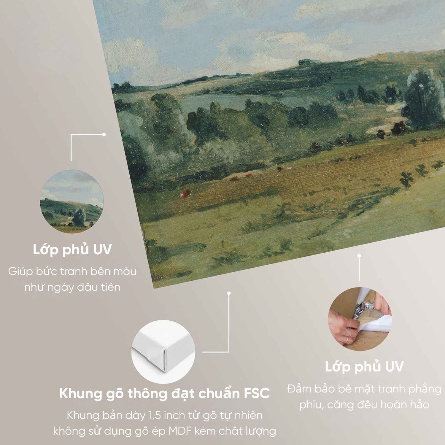 Treo tranh ở không gian thoáng, tránh ánh nắng trực tiếp, khu vực có độ ẩm, nhiệt độ cao. Dùng chổi lông gà hoặc khăn khô để làm sạch, không dùng khăn ướt và các loại hóa chất tẩy rửa.