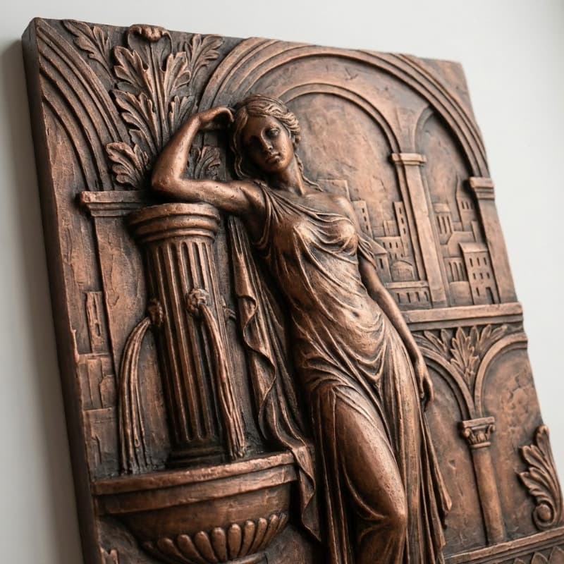 Mẫu phù điêu này khắc họa hình ảnh thiếu nữ tựa bên cột trang trí, phía sau là kiến trúc vòm cổ điển. Tổng thể cho cảm giác mềm, sang và thiên về thẩm mỹ decor hơn là ý nghĩa phong thủy.