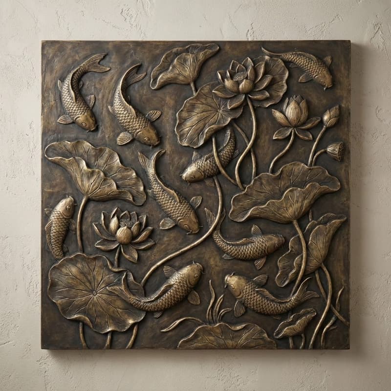 Mẫu tranh này lấy chủ đề cá chép và hoa sen trên nền vuông, bố cục dày và có nhịp điệu tốt. Đây là kiểu tranh decor phổ thông, dễ bán vì vừa có tính trang trí cao vừa gợi cảm giác sinh động, sung túc.