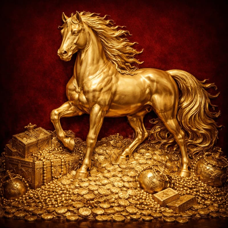 Bức tranh nổi bật với hình tượng ngựa vàng đứng vững trên nền kho báu, thể hiện rõ sự vững chắc, quyền lực và tài lộc dồi dào. Các chi tiết cơ bắp, bờm và dáng đứng được chạm khắc sắc nét, tạo hiệu ứng nổi khối chân thực. Nền đỏ đậm phía sau làm nổi bật sắc vàng ánh kim, mang lại cảm giác sang trọng, đẳng cấp và thu hút ánh nhìn ngay khi bước vào không gian.