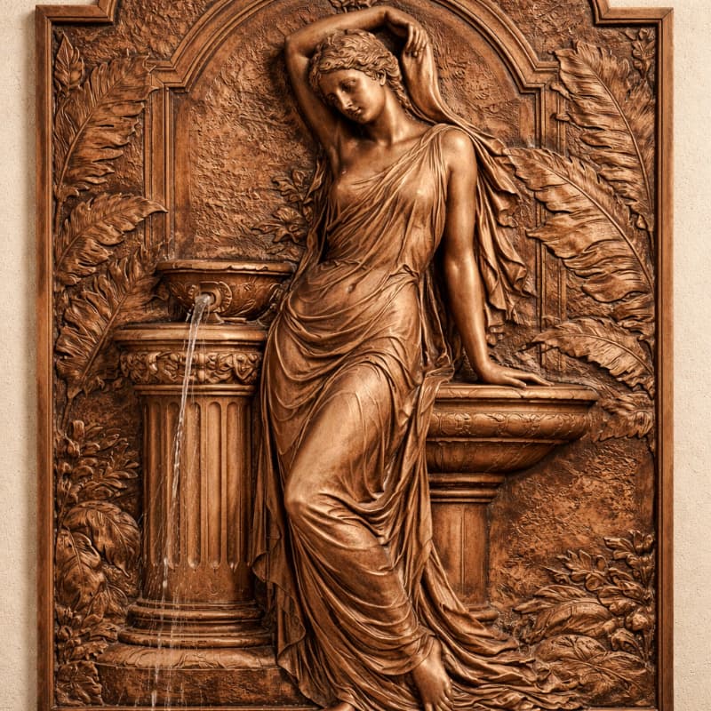 Mẫu tranh tái hiện hình ảnh người phụ nữ tựa bên đài phun nước cổ điển, tạo cảm giác mềm mại, quý phái và đậm chất châu Âu. Phần thân tượng, nếp vải và hệ cột phía sau được đẩy khối rõ, giúp tranh có chiều sâu thị giác tốt khi treo trong không gian lớn.