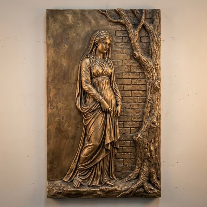 Mẫu phù điêu này khắc họa hình ảnh thiếu nữ đứng nghiêng bên thân cây và mảng tường gạch, tạo cảm giác cổ điển, trầm lắng và có chiều sâu nghệ thuật. Bố cục dọc giúp bức tranh phù hợp với các mảng tường hẹp, hành lang hoặc không gian cần điểm nhấn sang trọng.