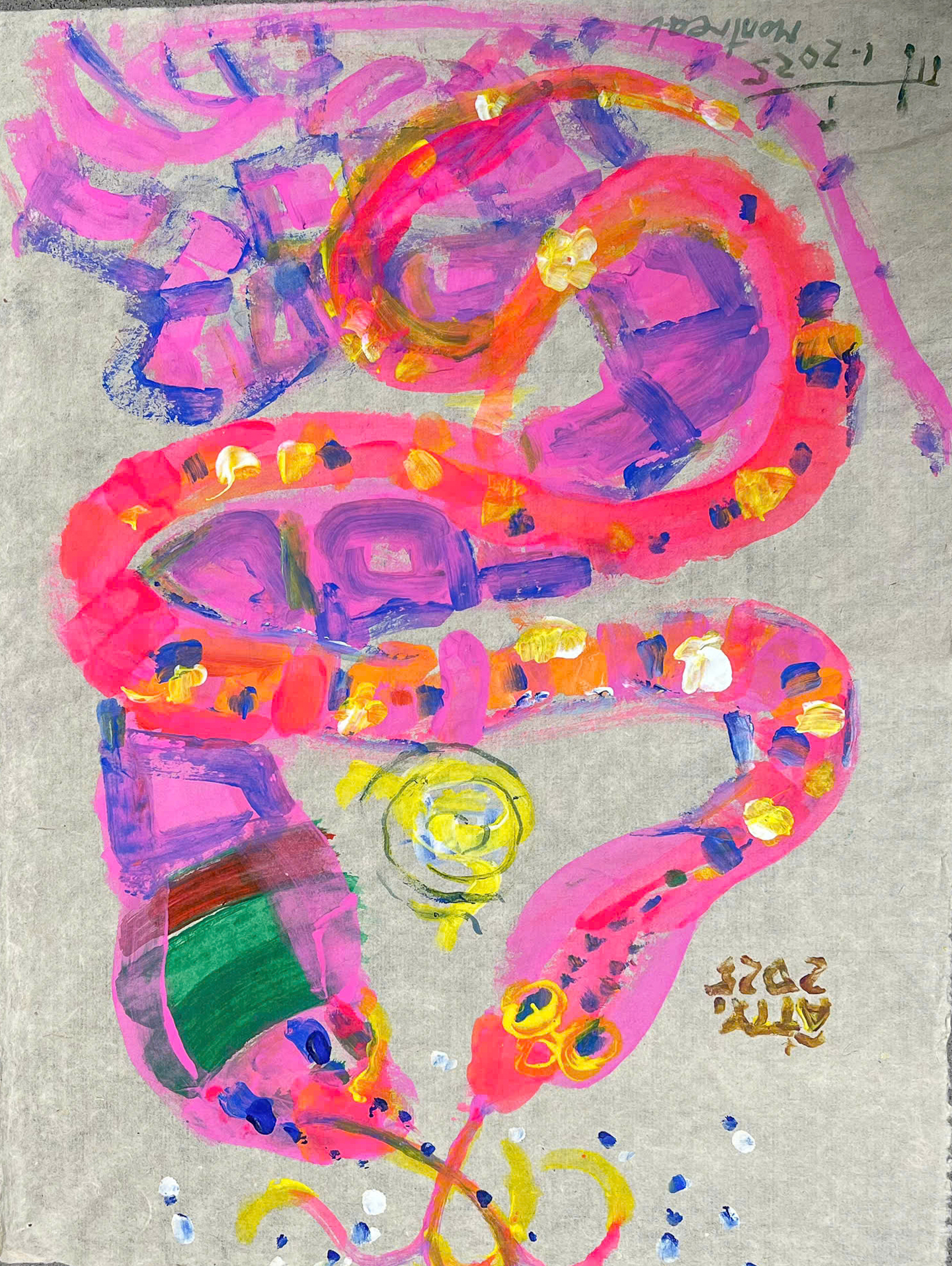 Series “Rắn Ất Tỵ” sáng tác năm 2025 là cuộc dạo chơi đầy ngẫu hứng giữa ngôn ngữ biểu hiện đương đại và tinh thần dân gian. Thay vì tả thực, họa sĩ giải phóng hình tượng linh vật qua những đường cong uốn lượn kịch tính, cuộn xoắn tự do trên nền giấy thủ công thô mộc.