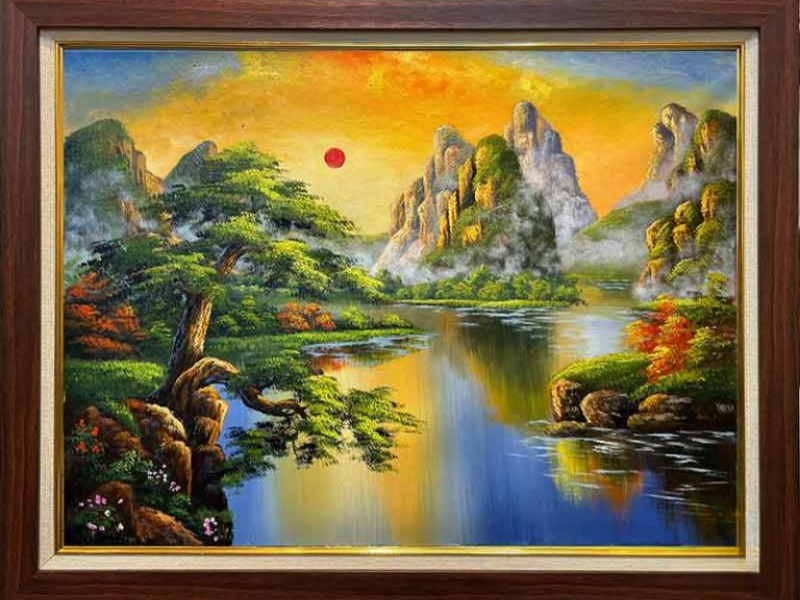 Bức tranh sơn thủy hữu tình hiện lên với vẻ đẹp hùng vĩ và thơ mộng, mang đậm ý nghĩa phong thủy tốt lành. Nổi bật giữa không gian là hình ảnh mặt trời đỏ rực đang tỏa ánh hào quang vàng óng xuống dòng nước xanh trong vắt, tạo nên sự phản chiếu lung linh và huyền ảo. Những dãy núi cao sừng sững, nhấp nhô giữa làn mây trắng bảng lảng, tượng trưng cho sự vững chãi và tài lộc trường tồn. Điểm xuyết bên bờ là những tán thông già xanh mướt cùng khóm hoa rực rỡ, mang lại cảm giác tràn đầy sức sống và sự bình yên. Sự kết hợp hài hòa giữa màu sắc và đường nét tạo nên một khung cảnh thiên nhiên tuyệt mỹ, mang lại vượng khí và may mắn cho gia chủ.