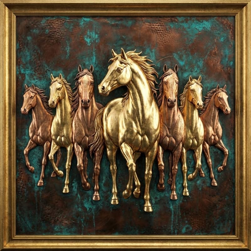 Mẫu tranh thất mã này phù hợp với người yêu phong cách quyền quý, hiện đại và đậm tính tài lộc. Tông vàng – xanh ngọc tượng trưng cho thịnh vượng, bền vững và hanh thông, rất thích hợp làm tranh treo phòng khách, tranh tặng tân gia, tranh tặng sếp hoặc quà mừng khởi đầu thuận lợi.