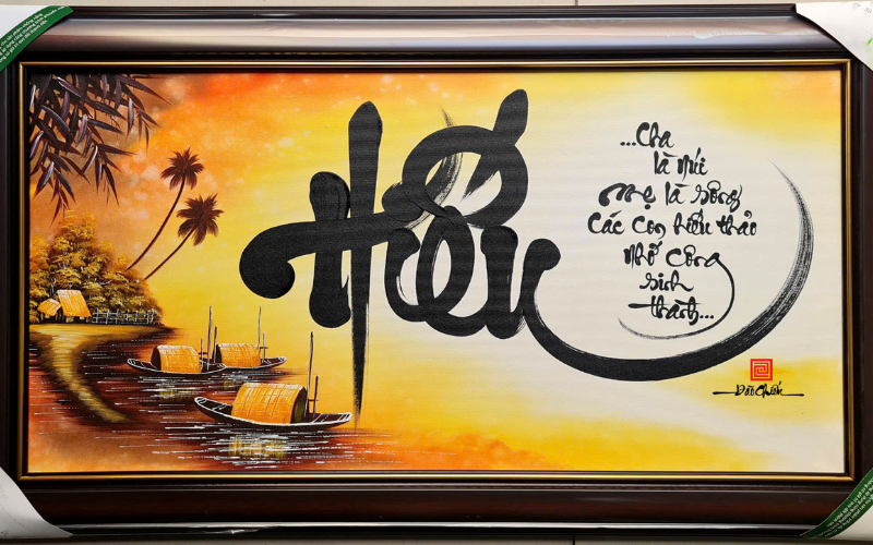 Bức tranh thư pháp chữ “Hiếu” hiện lên đầy tôn nghiêm trên nền hoàng hôn vàng rực rỡ, tôn vinh công ơn sinh thành dưỡng dục tựa núi cao biển rộng của cha mẹ. Hình ảnh những con thuyền nan bình yên bên bến quê mộc mạc gợi nhắc về cội nguồn và tình cảm gia đình ấm áp, sâu nặng. Với khung viền gỗ sang trọng cùng những dòng thơ ý nghĩa, đây là tác phẩm tuyệt vời để trang trí phòng khách hoặc làm quà tặng báo hiếu vô giá dành cho đấng sinh thành