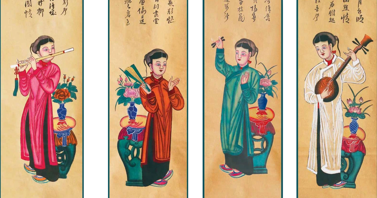 “Tranh Tố Nữ” là biểu tượng của vẻ đẹp thanh lịch, tinh tế trong văn hoá thị dân Việt xưa. Bốn người phụ nữ khoác áo dài rực rỡ, mỗi người cầm một nhạc cụ hay đạo cụ khác nhau – sáo, quạt, phách, đàn – như hòa vào bản nhạc của thời gian. Từng ánh mắt, nụ cười đều toát lên sự dịu dàng, đằm thắm, vừa kín đáo vừa sang trọng. Màu sắc tươi sáng, bố cục đối xứng và nét vẽ mềm mại khiến người xem như cảm nhận được hương sắc Hà thành thuở cũ – nơi nghệ thuật và đời sống từng hòa quyện trong sự tinh khiết, thanh tao, đầy chất thơ.