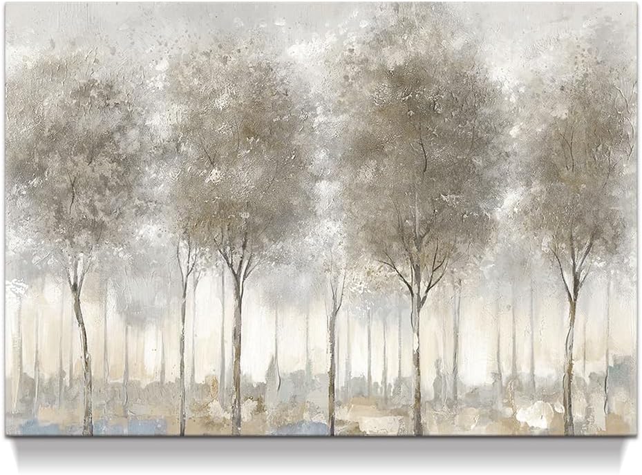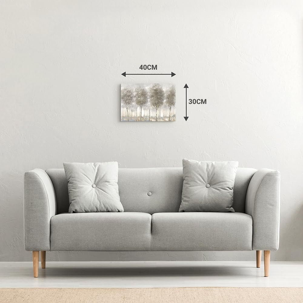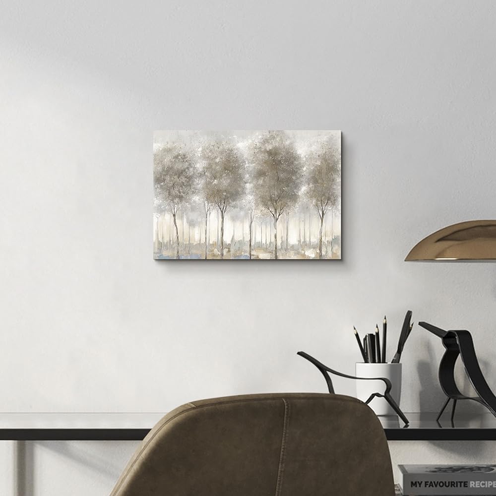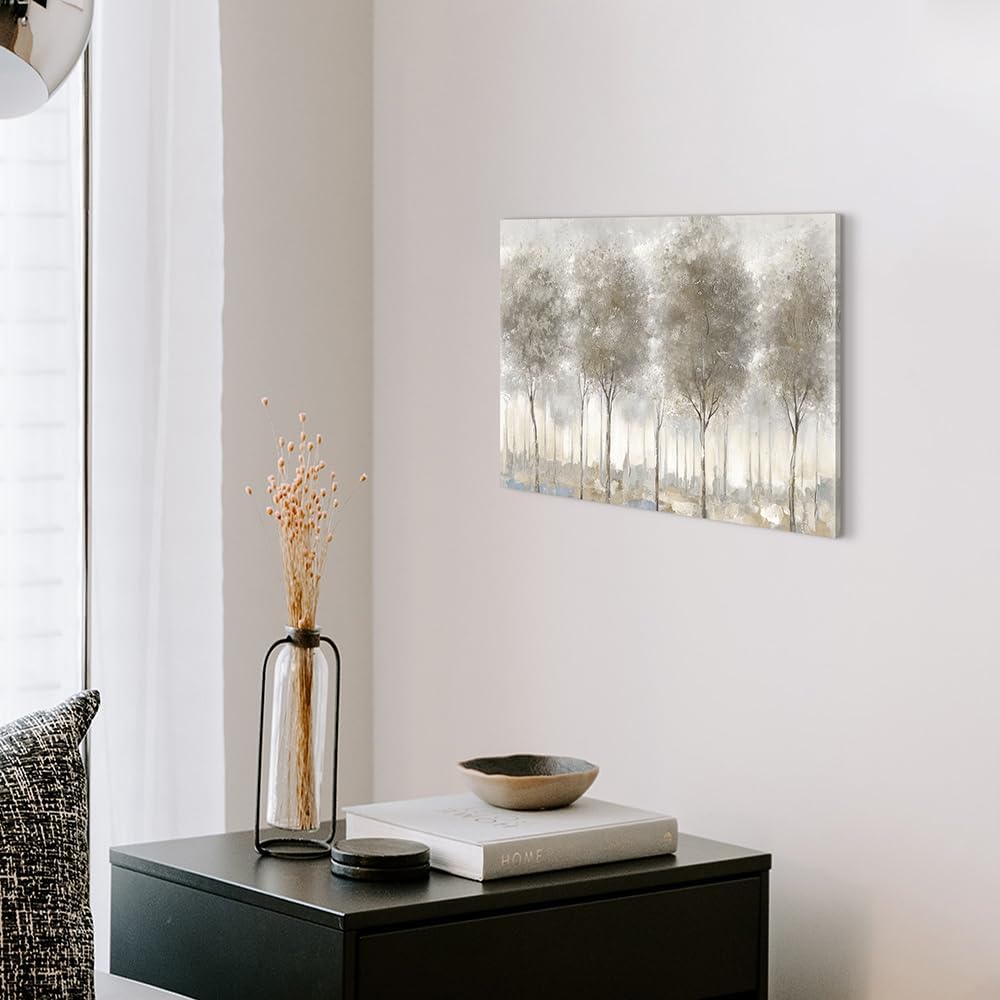 Nghệ thuật trừu tượng trên vải canvas miêu tả rừng cây trong sương bằng gam màu trung tính mở rộng chiều sâu cho không gian phòng khách.