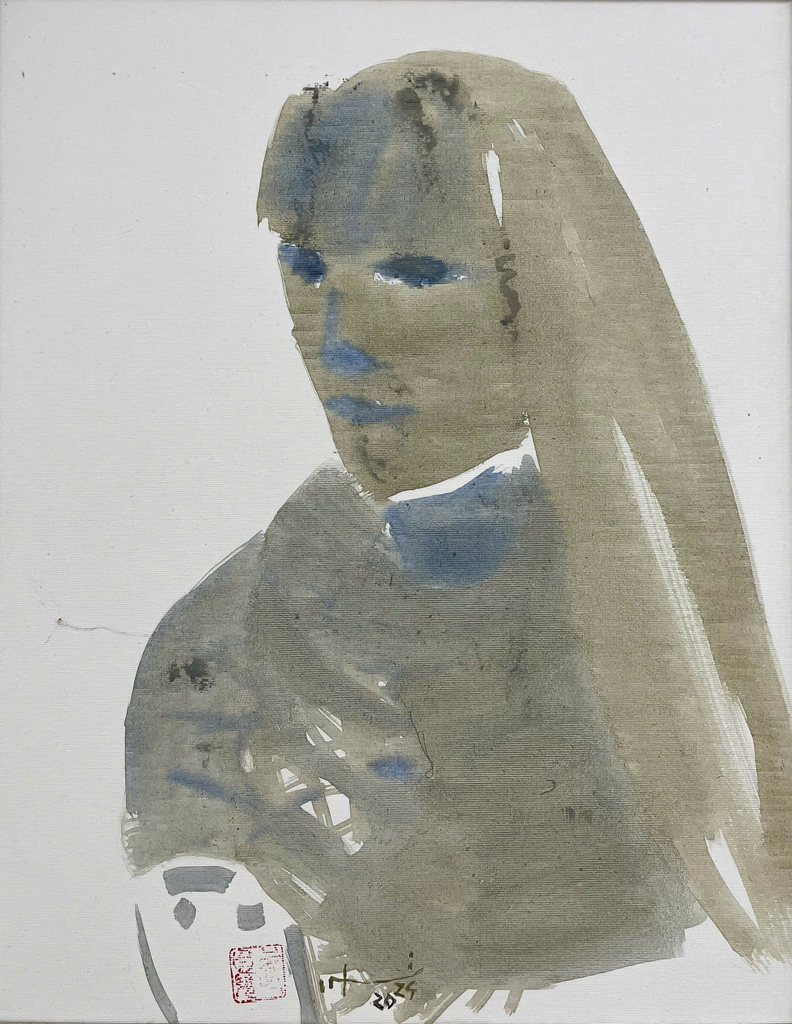 “Tự Họa” sáng tác năm 2024 mang gương mặt được phác họa bằng những mảng màu trung tính như xám, nâu đất và điểm xuyết sắc xanh lam, giữ vai trò điểm tựa thị giác giữa khoảng không trắng của nền toan. Hình tượng không tập trung vào chi tiết diện mạo mà hòa vào bề mặt tranh bằng những nhát cọ loang nhẹ, tạo nên cảm giác về một bản ngã đang tự chiêm nghiệm, vừa hiện hữu vừa tan biến vào thinh lặng.