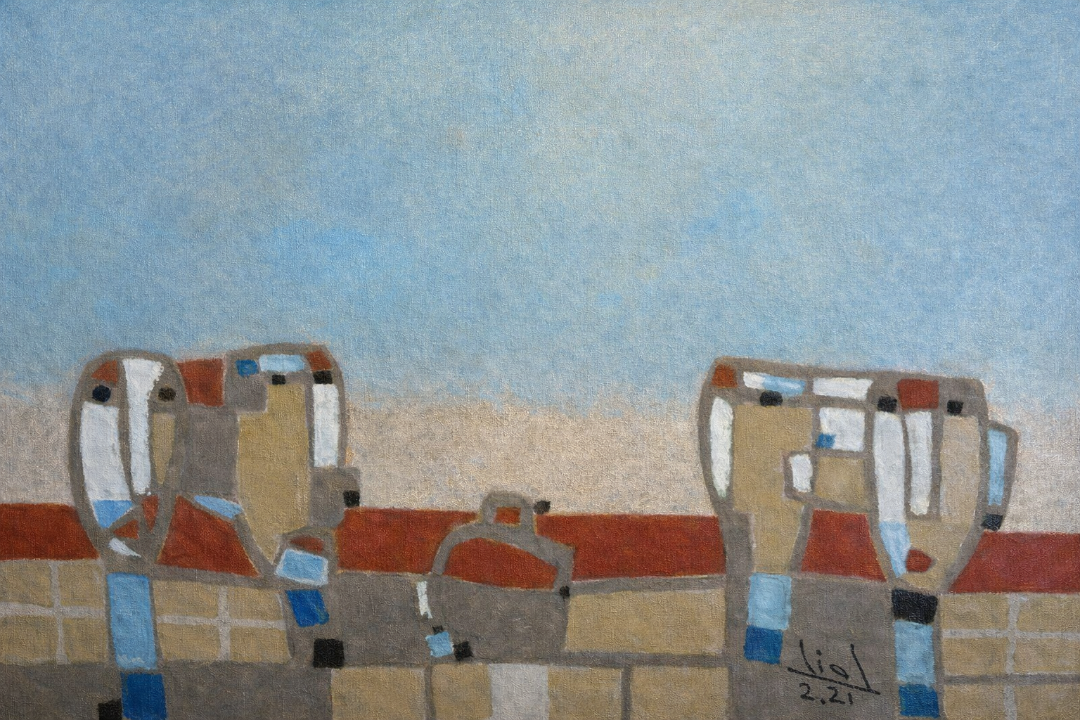 “Trò Chuyện” mở ra một không gian được tiết giảm đến mức tối thiểu, nơi hình ảnh không còn mang tính mô tả, mà trở thành dấu vết của cảm nhận. Hai hình thể đối diện nhau, được cấu thành từ những mảng màu nhỏ và đường viền giản lược, gợi liên tưởng đến con người nhưng không hoàn toàn cố định trong một định danh cụ thể. Giữa chúng là một khoảng trống vừa đủ, tạo nên một dạng đối thoại lặng, không rõ nội dung, chỉ còn lại trạng thái.