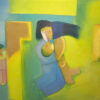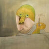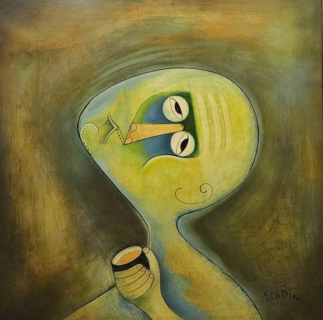 “Tự họa” sáng tác năm 2021 là một phút trầm tư giữa sắc xanh lặng. Gương mặt nghiêng, đôi mắt như nhìn về nơi xa xăm, vừa mơ hồ vừa tỉnh thức. Trong tay, chén nhỏ nâng nhẹ, biểu tượng của một khoảnh khắc dừng lại giữa dòng suy tưởng. Các mảng màu xanh, vàng, nâu tan vào nhau, gợi cảm giác của sương, của khói, của thời gian trôi chậm. Không ồn ào cũng chẳng buồn bã, bức họa như một tách trà được uống trong tĩnh lặng. Ở đó, người họa sĩ không tìm cách phơi bày bản thân, mà chỉ khẽ ghi lại một hơi thở, nơi cái tôi tan ra trong bình yên, và nghệ thuật trở thành thiền định.