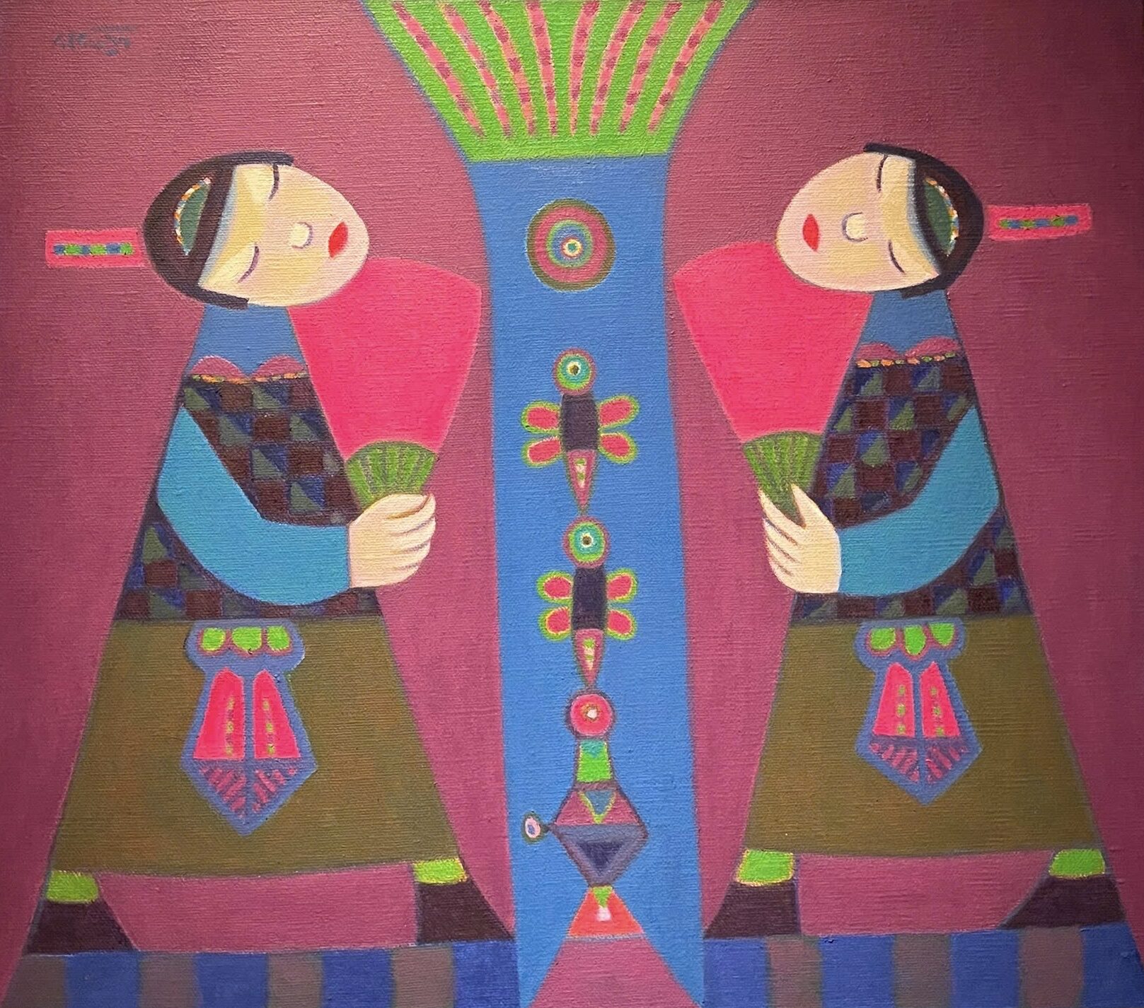 “Twins 1” sáng tác năm 2024, là khúc hoạ về sự đồng điệu và phản chiếu. Hai thiếu nữ cầm quạt đứng đối xứng, ánh nhìn khép hờ như đang đắm mình trong thế giới riêng. Những mảng màu phẳng: lam, hồng, tím cùng họa tiết hình học tinh giản tạo nên cảm giác của một nghi lễ tĩnh tại, nơi hai cá thể dường như soi chiếu tâm hồn nhau. Ẩn dưới nét ngây thơ là tinh thần thiền định, nơi cái đẹp không nằm ở sự khác biệt, mà ở nhịp thở chung giữa hai nửa của cùng một bản thể.