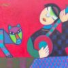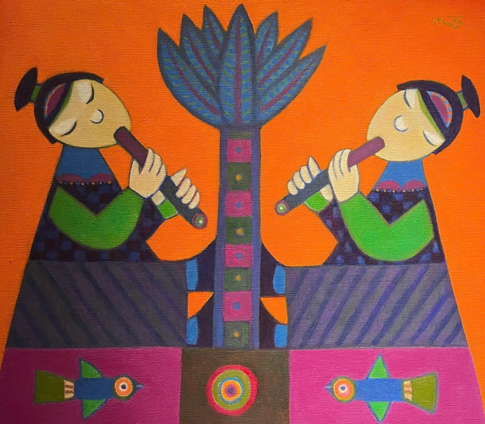 “Twins 2” sáng tác năm 2024, hai nhân vật như hai nốt nhạc đối xứng giữa một bản hòa âm rực rỡ. Gam cam ấm làm nền cho sắc xanh, tím tạo nên cảm giác vừa cổ tích, vừa đương đại. Bút pháp tối giản, hình khối phẳng nhưng tinh tế, gợi nên nhịp điệu và sự đồng điệu tâm hồn. “Twins 2” không chỉ là chân dung đôi mà còn là biểu tượng cho sự giao cảm, nơi hai bản thể soi chiếu nhau qua âm thanh, qua nghệ thuật và qua chính sự tĩnh tại của tâm hồn.
