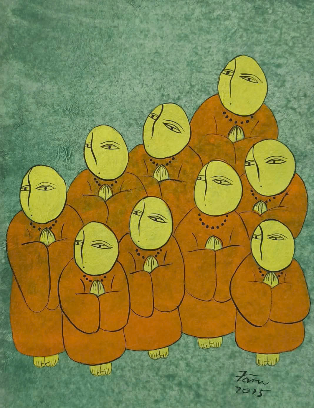 “Vạn Chân Như” mô phỏng hình ảnh một tăng đoàn đang hội tụ trong sự hòa hợp và nhất tâm. Với bố cục tập trung, những vị tỳ kheo được khắc họa với nét mặt an nhiên, đôi tay chắp lại thành kính như những đóa sen vươn lên từ tâm thức. Sắc cam nồng ấm của y phục nổi bật trên nền xanh rêu cổ kính, tạo nên một không gian nghệ thuật vừa trang nghiêm, vừa gần gũi. Thông điệp của tác phẩm nằm ở sức mạnh của sự đoàn kết và lòng từ bi lan tỏa. Hình ảnh nhiều vị tăng cùng hiện diện nhắc nhở chúng ta rằng, khi những tâm hồn lương thiện cùng hướng về một mục đích thanh cao, ánh sáng của trí tuệ sẽ trở nên rạng rỡ hơn bao giờ hết. Đây là bức tranh đại diện cho sự bình an tự tại và tinh thần hòa hợp vô biên.