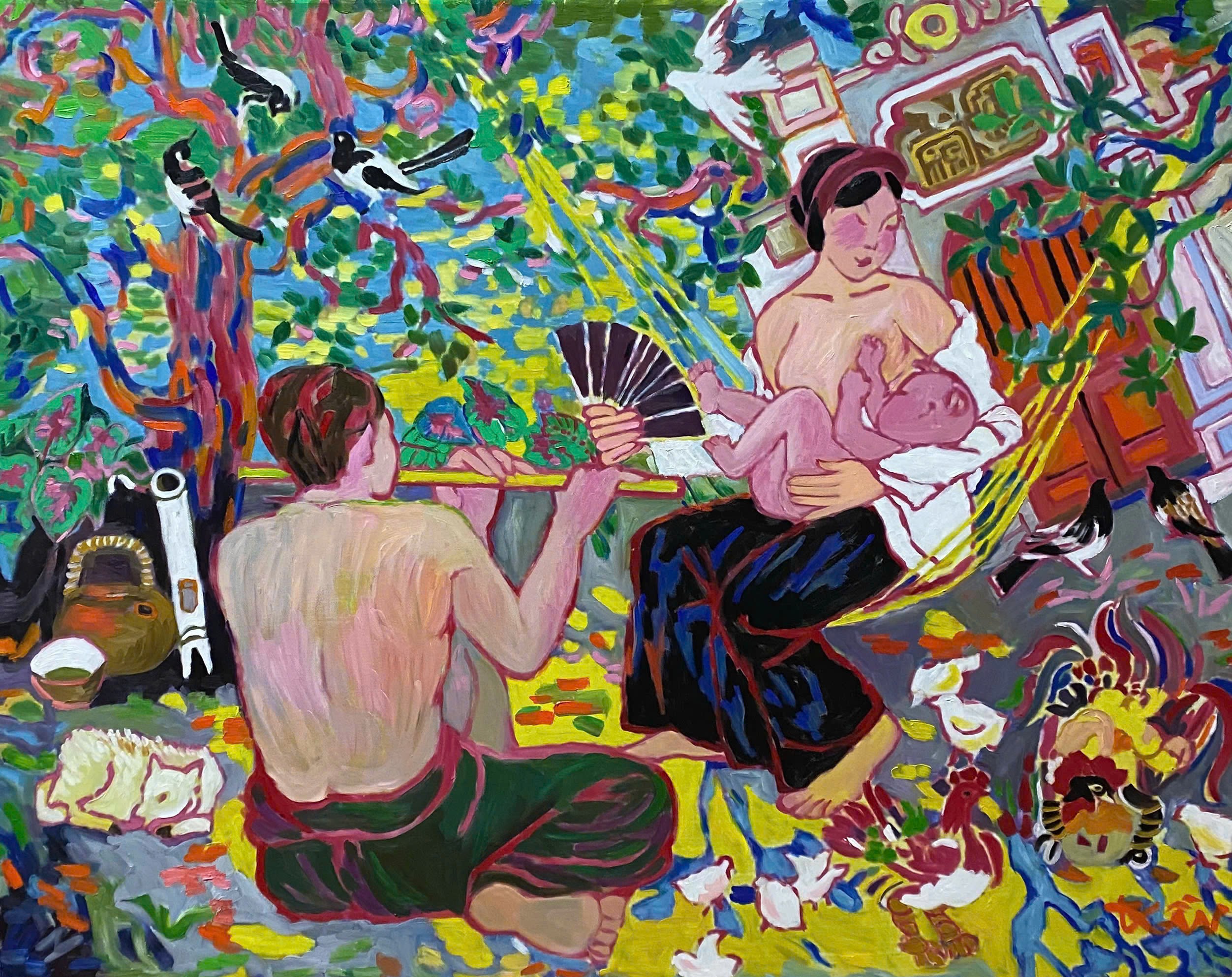 “Vòng Tay Cội Nguồn” mở ra một không gian sinh hoạt đậm đặc ký ức dân gian, nơi hình ảnh người mẹ cho con bú, người đàn ông ngồi đối diện, chim muông, cây cối và đồ thờ cùng hiện diện trong nhịp điệu rực rỡ của màu sắc. Các mảng hình được sắp đặt tự do, giàu tính biểu tượng, gợi cảm giác về sự che chở, sinh sôi và kết nối. Bức tranh gửi gắm thông điệp về vòng tuần hoàn của sự sống, nơi gia đình và văn hóa truyền thống âm thầm nuôi dưỡng con người qua nhiều thế hệ.
