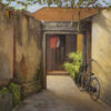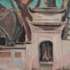 “Vọng” sáng tác năm 2025, là góc nhìn đầy chiêm nghiệm về vẻ đẹp cổ kính trong kiến trúc Việt. Hình ảnh linh vật nằm trên mái đình được khắc họa trong ánh hoàng hôn nhẹ, khi màu trời xanh thẫm chuyển dần sang gam đồng ấm. Bút pháp dầu chắc tay, mảng sáng tối rõ, nhịp cọ dứt khoát nhưng vẫn giữ được độ mềm của không khí. Sự giao thoa giữa kiến trúc và thiên nhiên, giữa đá và mây, gợi cảm giác lắng đọng của thời gian – nơi con người đứng trước di sản, lặng yên cảm nhận tiếng vọng của quá khứ trong hiện tại.
